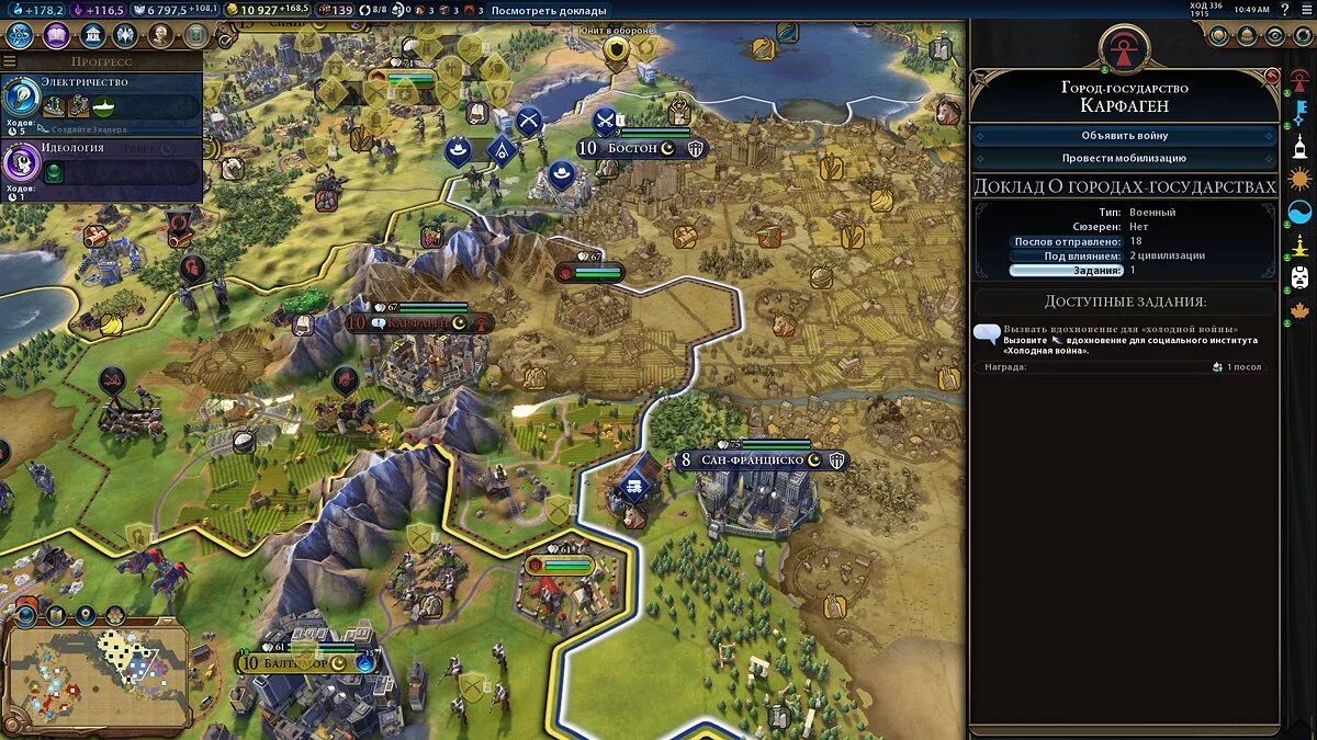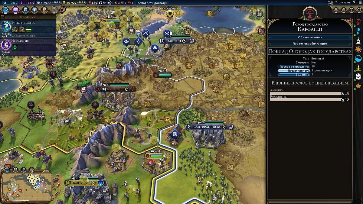 Проблема есть и в том, что послов надо распределять на все города-государства, а когда вам их дают по 2-3 штуки, то ни о каком доминировании говорить не приходится. Изменить ситуацию можно, если выполнять задания от городов-государств — тогда число послов может возрасти до 5-6. Это хорошо сработает, когда вы будете постоянно выполнять задания ГГ и планомерно накапливать послов. Со временем вы получите заметно больше послов, чем ваши соседи из числа цивилизаций.