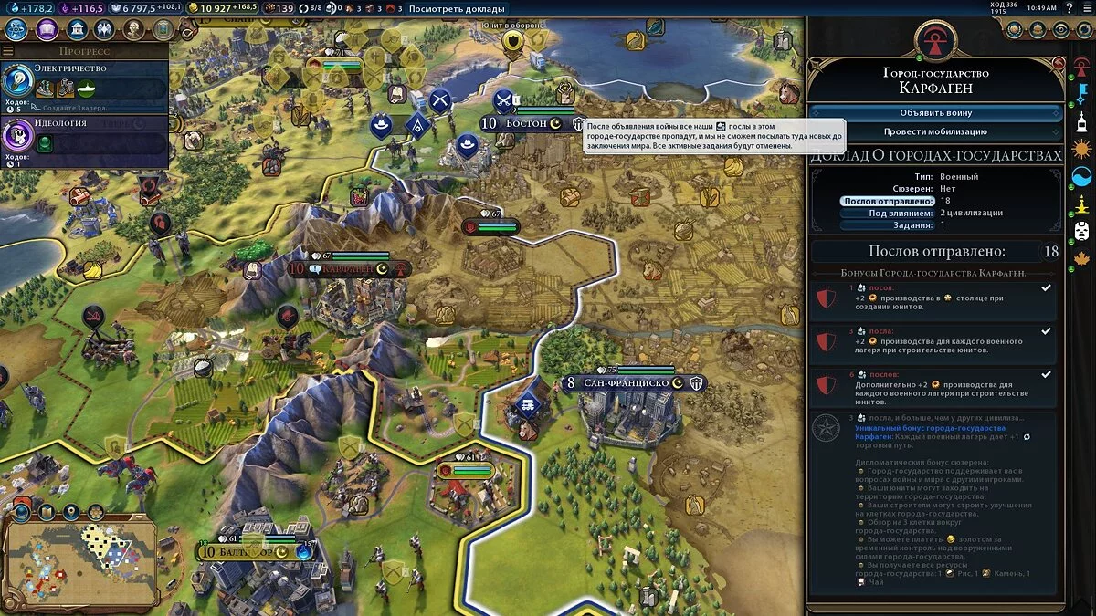 В последнем случае при начале войны с другой цивилизацией, союзные ей города-государства также объявят вам войну, а ваши послы будут высланы, вы потеряете все бонусы сотрудничества. В мирное время послы вернутся в ГГ, но в любом случае вы не сможете их отозвать, чтобы направить на другие участки деятельности, поэтому внимательно распределяйте послов — это раз и навсегда.