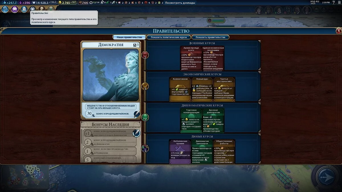 Важно! В Civilization 6 реализован так называемый «Бонус Наследия», который выражается в переносе бонусов предыдущей формы правления при принятии новой формы правления, посмотреть полный список бонусов можно в первом меню, в левом нижнем углу: