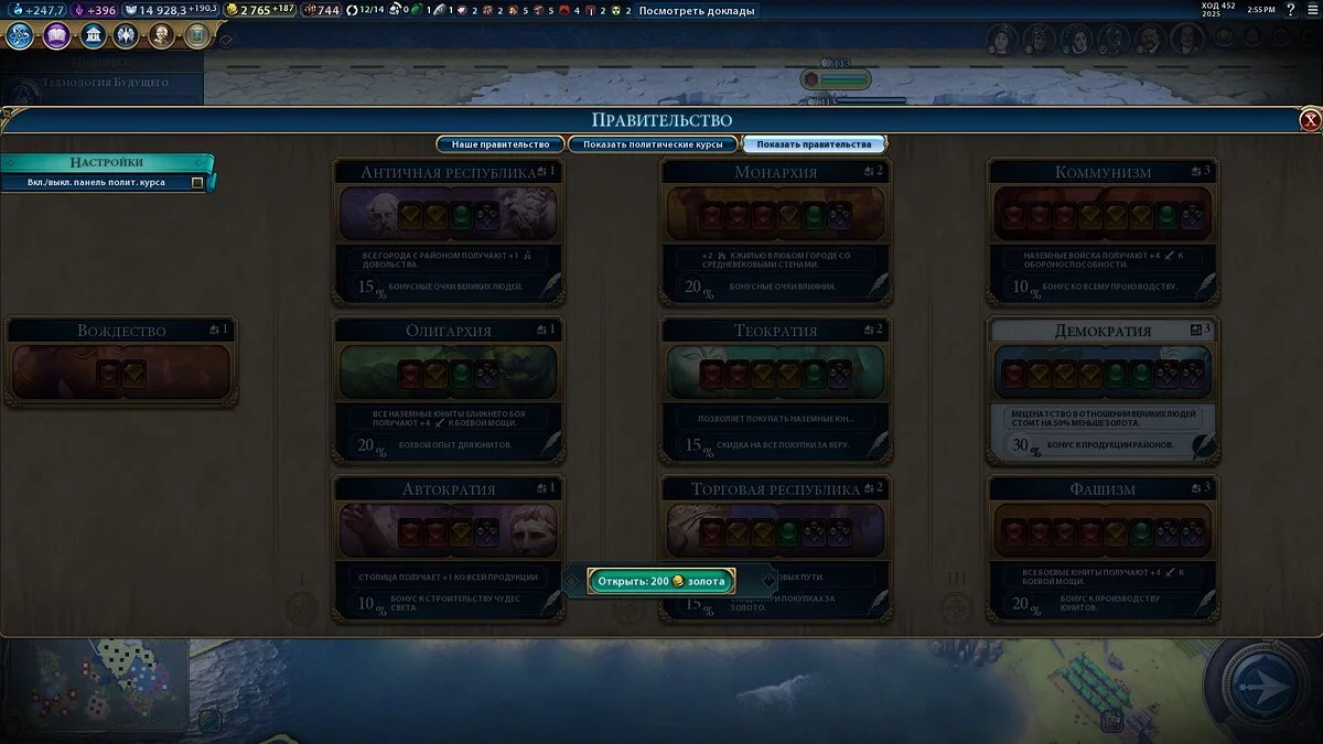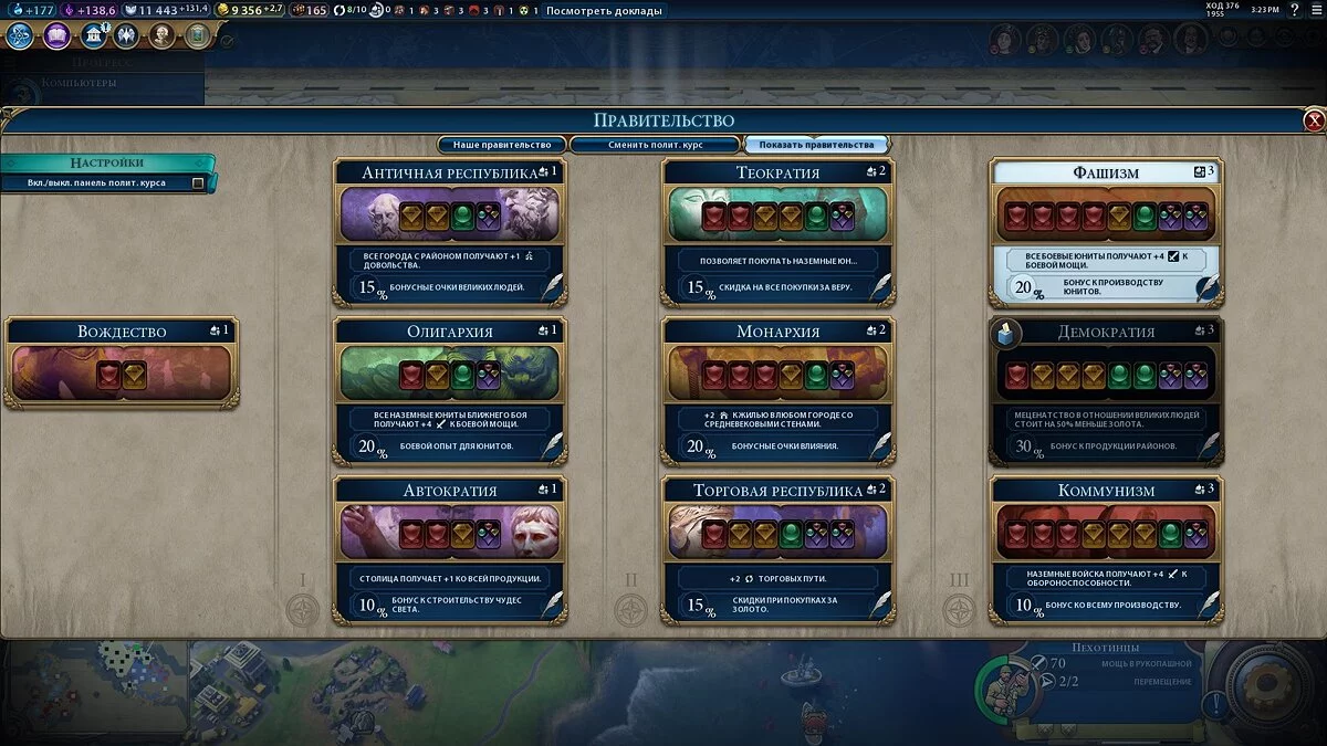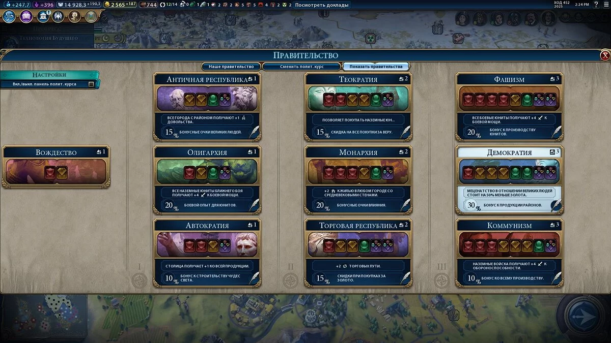 Чтобы посмотреть на все формы правления, нужно перейти в третье меню, которое почему-то называется «Показать правительства». Действующая форма правления выделена белым цветом:
