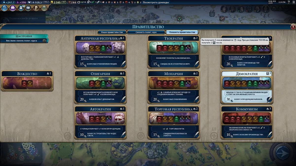 Узнать бонусы формы правления, можно внимательно поводив мышкой по их описанию. Поиск пикселей относится ко всему интерфейсу Civilization 6, так что проявите терпение даже к таким мелочам, как маленькая иконка справа от названия формы правления, где спрятано описание получаемых очков влияния на города-государства за ход и число получаемых послов:
