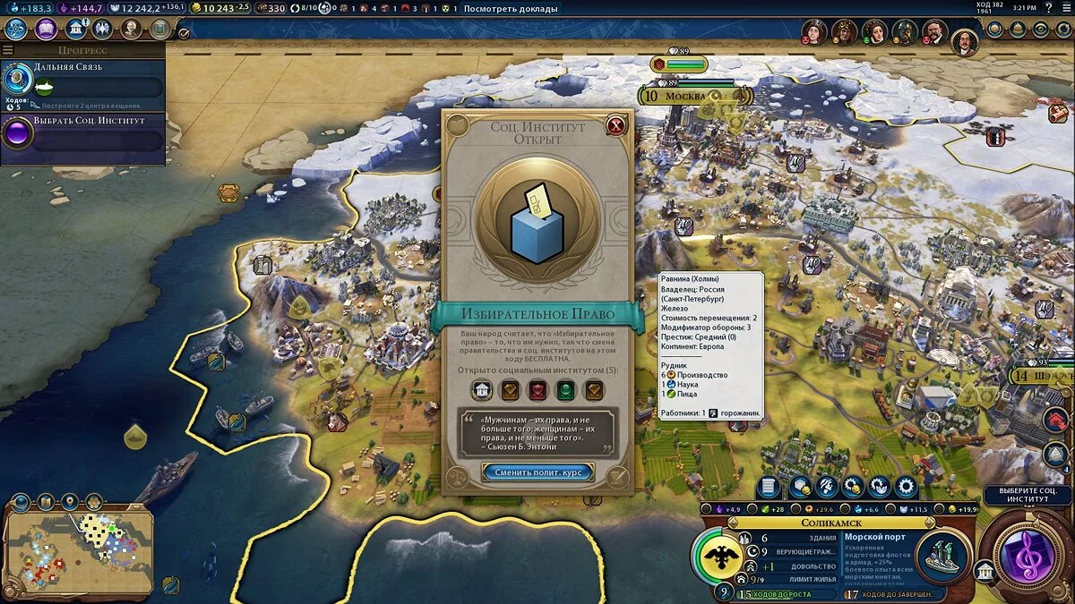 В то время как строительство районов и улучшение клеток является постепенным развитием, эдаким базисом, то смена политик способна в первые 10-15 ходов кардинально изменить ситуацию, особенно в конце игры, поскольку политики являются эдакими модификаторами, порой даже удваивающими поступление золота или скорость строительства юнитов.