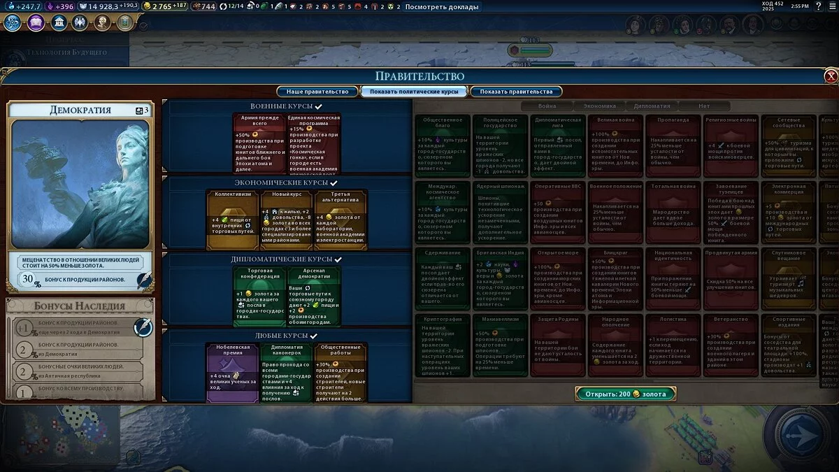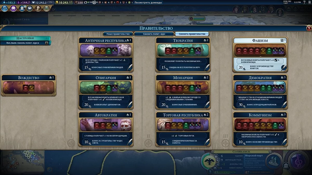 В последних двух тройках определяющим фактором для выбора конкретной формы правления будет текущая игровая ситуация и сумма необходимых профильных курсов и любых курсов. Последнее важно в виду того соображения, что вам банально может не хватить слотов для карточек политик, то есть их нужно предварительно подсчитать.