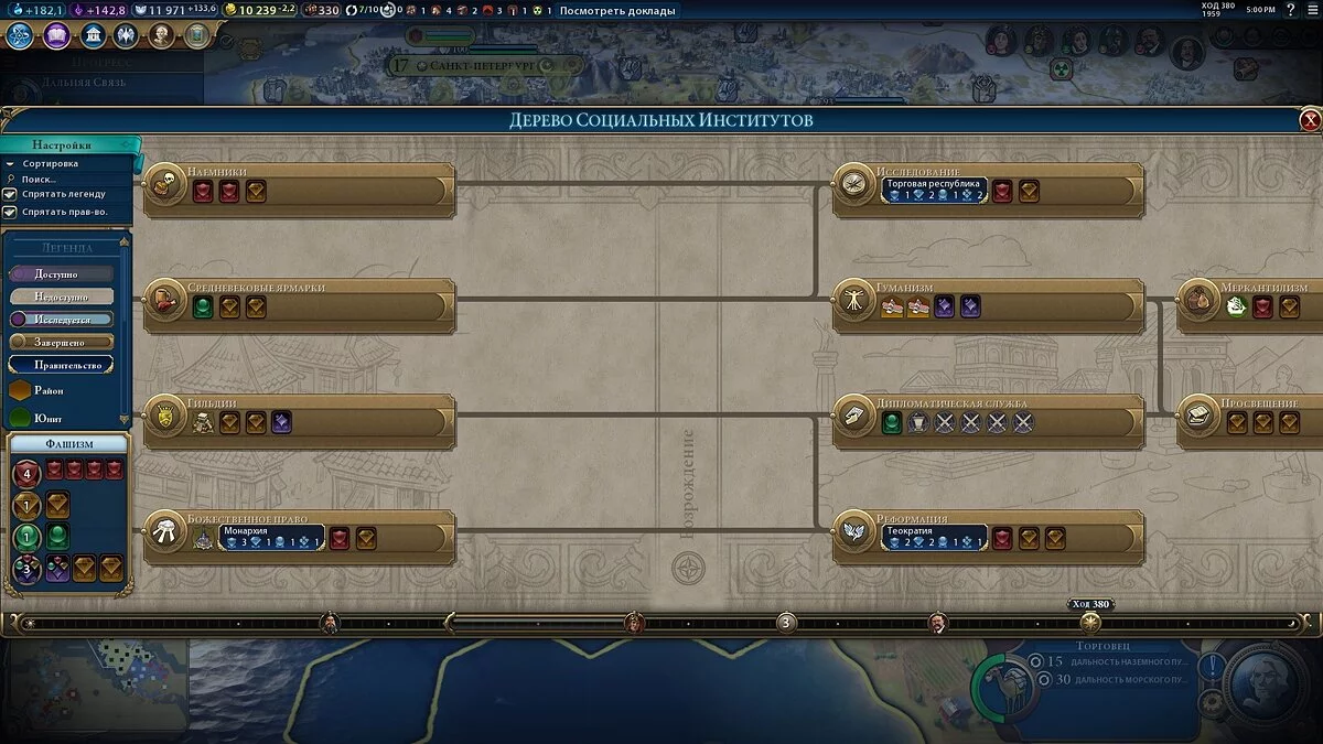 Следующая тройка форм правления открывается уже разными технологиями, причем разбросанными на разных ветвях древа гражданских наук, а Теократия во многом является продолжением Монархии, в то время как Торговая республика противостоит им: