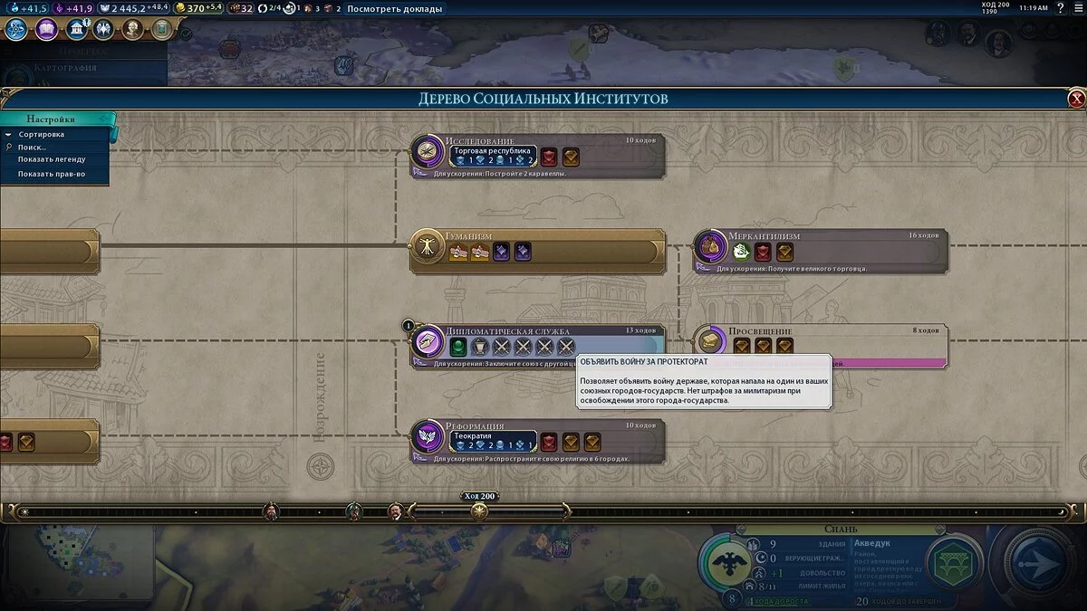 - Война за протекторат — для возможности объявления требуется изучить гражданскую науку «Дипломатическая служба». Используйте эту возможность только тогда, когда другая цивилизация напала на подконтрольный вам город-государство и вы не получите никаких штрафов за милитаризм. Если город-государство был захвачен врагом, пока вы собирались с силами, вы не получите штрафов за захват города-государства, если освободите его.