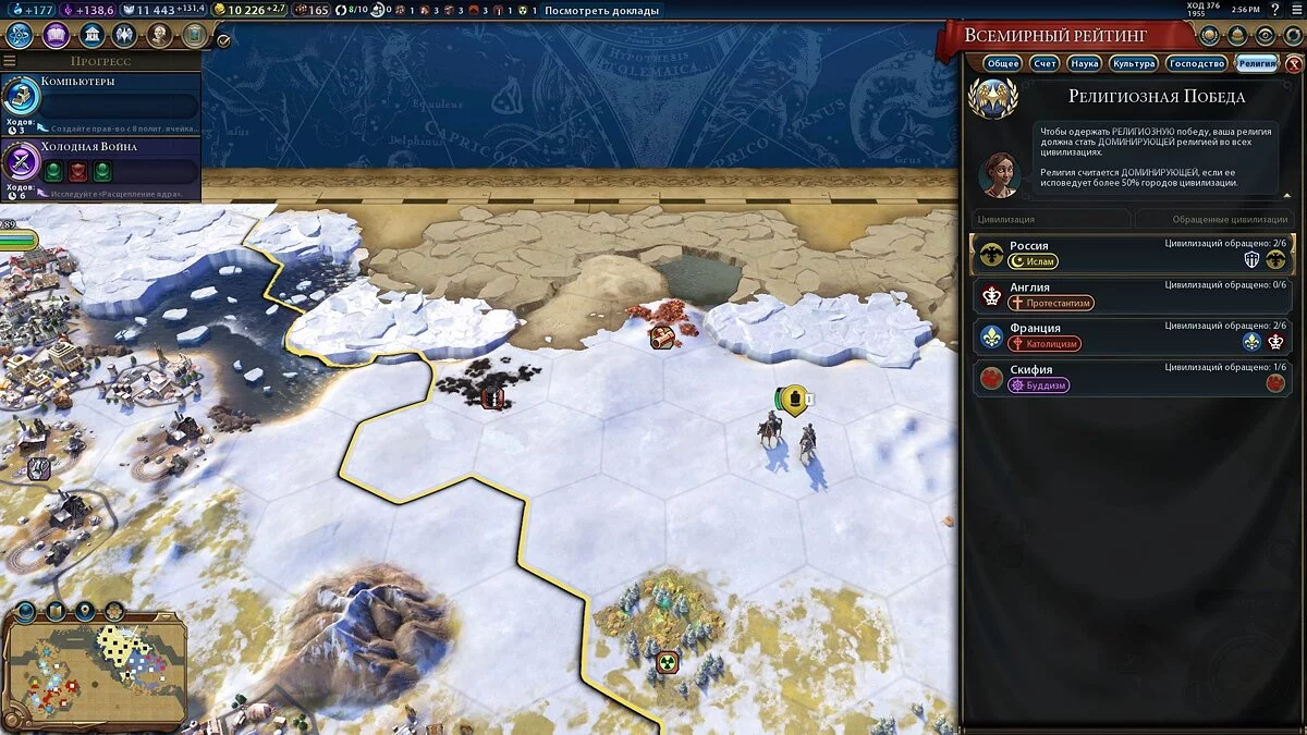 Достичь религиозной победы под конец игры довольно проблематично ввиду появления новых знаний и уменьшения религиозного влияния — большая его часть перетекает в культурное влияние. Поэтому, упустив возможность победить, рассмотрите вариант культурной победы. О том, как достичь культурной победы, читайте в нашем отдельном гайде.