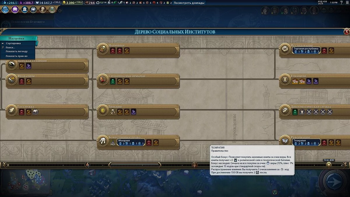 Эту форму правления придется удерживать как можно дольше, поскольку именно она предназначена для быстрой религиозной победы. Ситуации бывают разные, но во времена «Теократии» вы должны занять все города на своем континенте и подготовить базу для обращения городов, расположенных на других континентах. Не забывайте о том, что города-государства также желательно обращать в вашу веру.