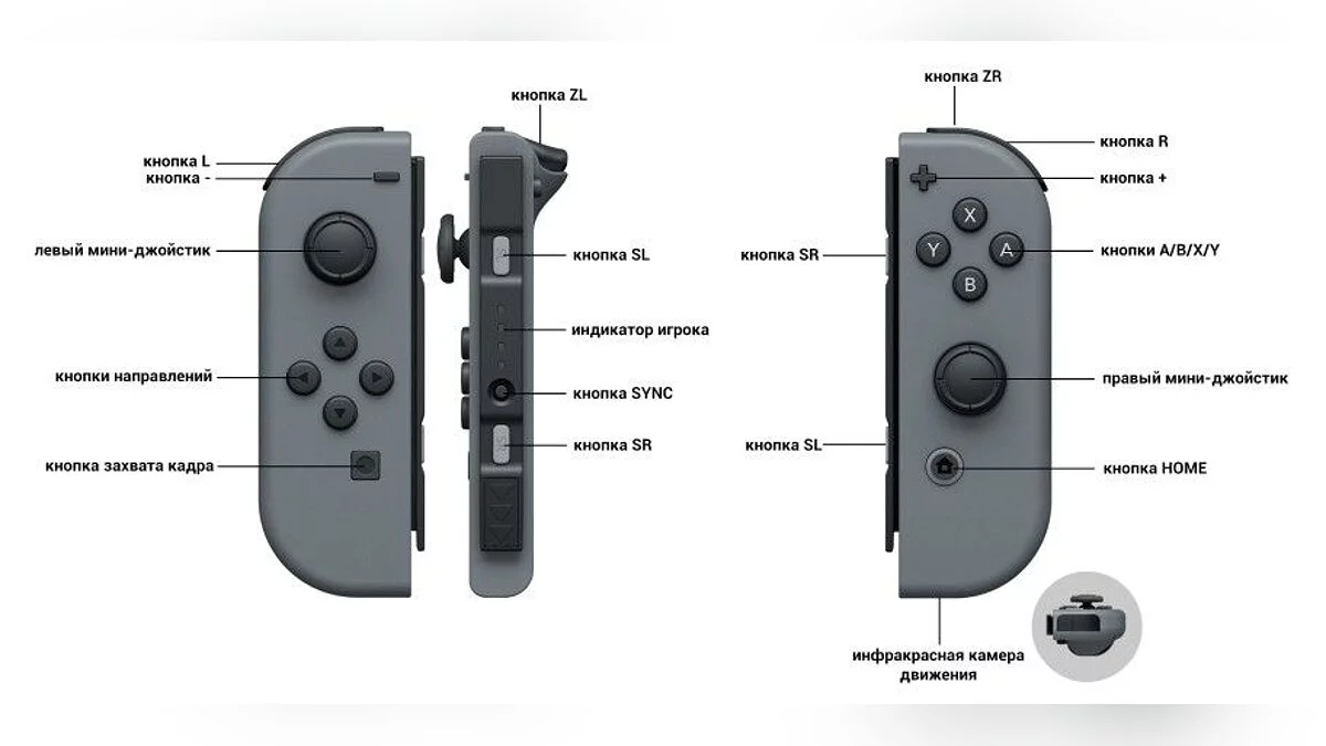 Итак, Switch представляет из себя гибридную консоль, но, конечно, по большей части портативную. На планшете располагаются крепления с магнитами для двух контроллеров, называемых Joy-Con. Они крайне похожи, но имеют разницу не только в относительно несимметричном в расположении кнопок, но и в других элементах управления. Так, на левом Joy-Con находится кнопка для снятия скриншотов (а позже и для записи видео), на правом — кнопка домой, сканер NFC для фигурок Amiibo (отдельный вид развлечения для поклонников Nintendo) и инфракрасный сенсор. Задача последнего состоит в считывании различных жестов, сама Nintendo привела в пример игру «Камень, ножницы, бумага».