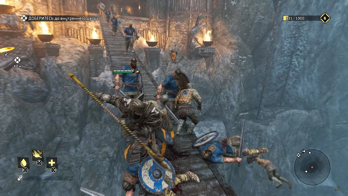 После некоторой практики находим второе «второе дно». При численном перевесе в сторону врага индикатор атаки будет указывать лишь на одного, но ничего не мешает вам блокировать все атаки, нужно лишь прочитать направление по анимации или попросту угадать. Адреналин в такие моменты накатывает бурными волнами. А есть еще финт на парирование, гарантированные атаки, эффекты оглушения... Словом, мы очень ждем от For Honor выхода на киберспортивную арену, чтобы увидеть все эти нюансы в действии в руках профессионалов.