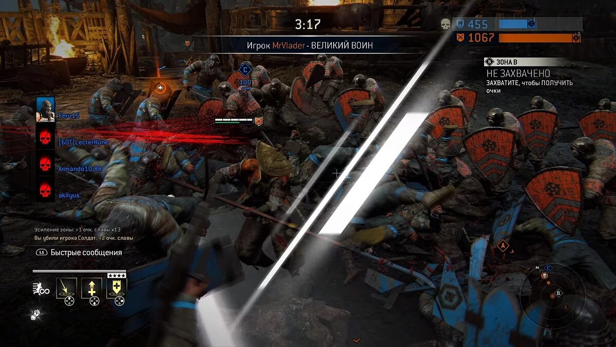 Точки эти буквально являются единственным предметом спора в мультиплеере For Honor. Помимо жизни, разумеется. Подавляющее большинство режимов посвящено умерщвлению в том или ином виде. Дуэль, схватка «2-на-2», классический Deathmatch и Last Standing «4-на-4» — везде нужно просто убивать, в остатке имеем тот самый захват точек. Всего их три, две простые, третья похожа на военный фронт, кто дальше протащил его, тот и забирает точку. «Тащить» нужно убийством массовки, она же позволяет накапливать уровень, добавляет очки и активирует некоторые пассивные умения. Собственно, все. Убиваем и захватываем. Вам маловато контента?