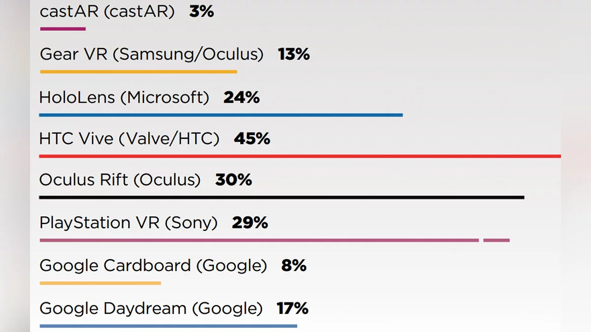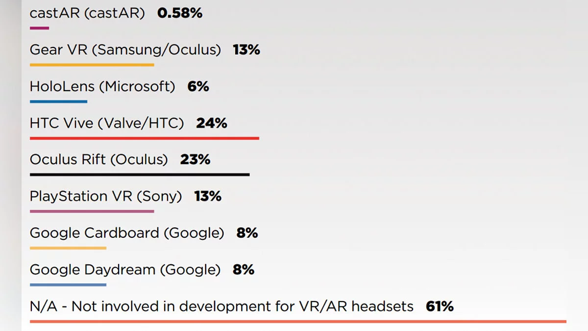 Лидерство разделили HTC Vive (24%) и Oculus Rift (23%), в то время как за детищем Sony всего лишь 13%. Столько же и у Gear VR от Samsung. Google Cardboard и Daydream оказались в «хвосте», набрав по 8%, а HoloLens от Microsoft заняла предпоследнее место с 6%. Хуже только castAR (0.58%), хотя о ней подавляющее большинство разработчиков и вовсе не знает. Все остальные участники опроса, составляющие 61% от общего числа, ответили отрицательно: они не разрабатывают игры для виртуальной реальности.