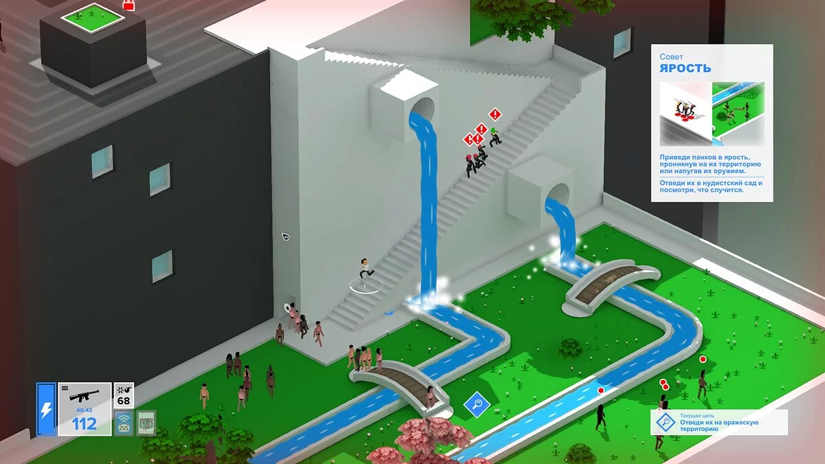 Впрочем, суть мультиплеера Tokyo 42 схожа с тем, чем нужно заниматься в одиночном режиме. Участники боя появляются в разных точках города и ведут охоту друг на друга. Благодаря системе маскировки и плотному людскому трафику в поиск противника превращается в настоящую головоломку.