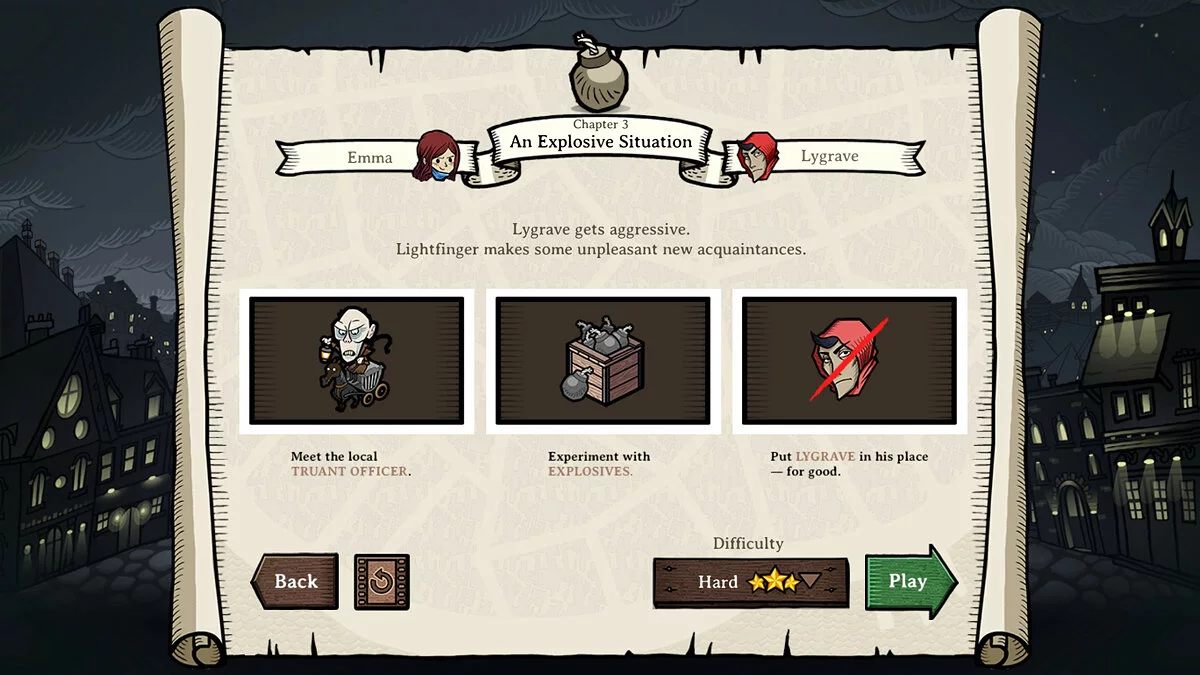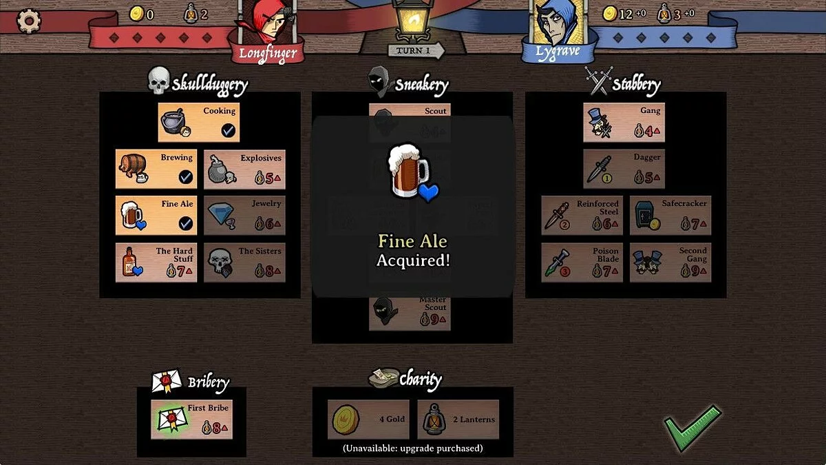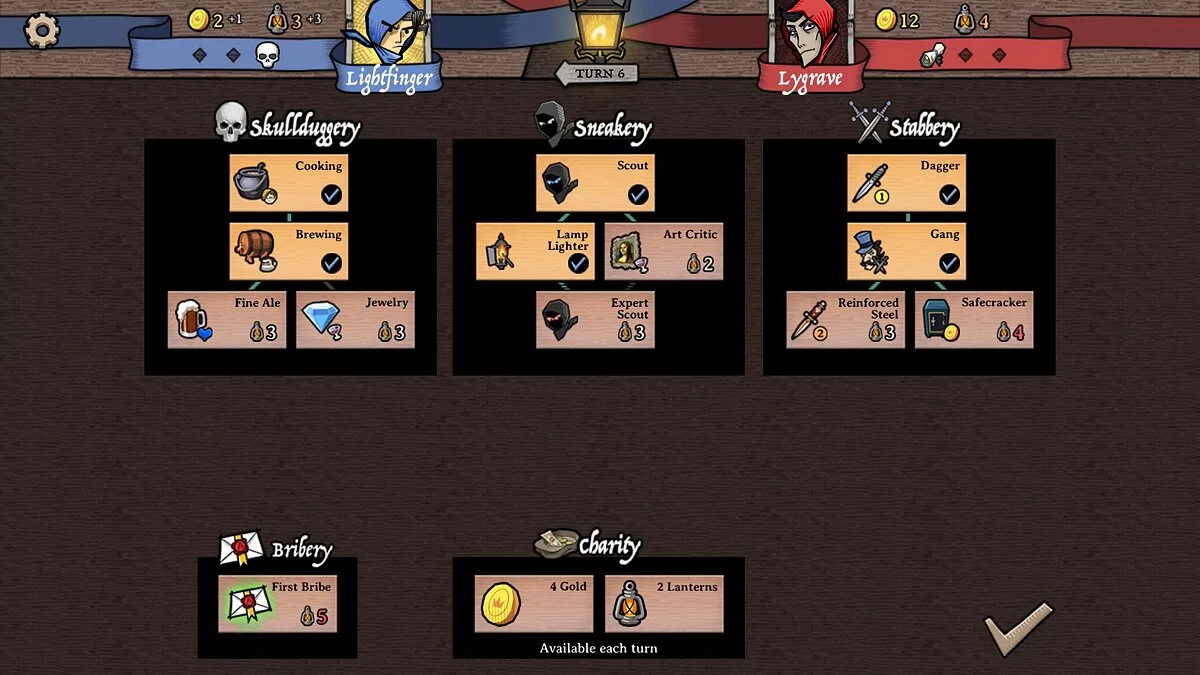 На каждом ходу можно по несколько раз использовать мастера-вора и всех остальных юнитов в любой последовательности, а также потратить имеющиеся на руках ресурсы для улучшения гильдии по трем основным веткам: экспансия, скрытность и убийства.