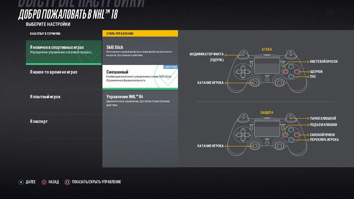 Первое, с чем сталкивается любой, кто запускает игру, это очень удобный инструмент настройки сложности. Девелоперы предлагают что-то вроде анкеты из 4 вопросов, на основе которой NHL 18 выставляет наиболее комфортный пресет из кучи самых разных опций, вплоть до отключения травм и упрощения игровых правил.