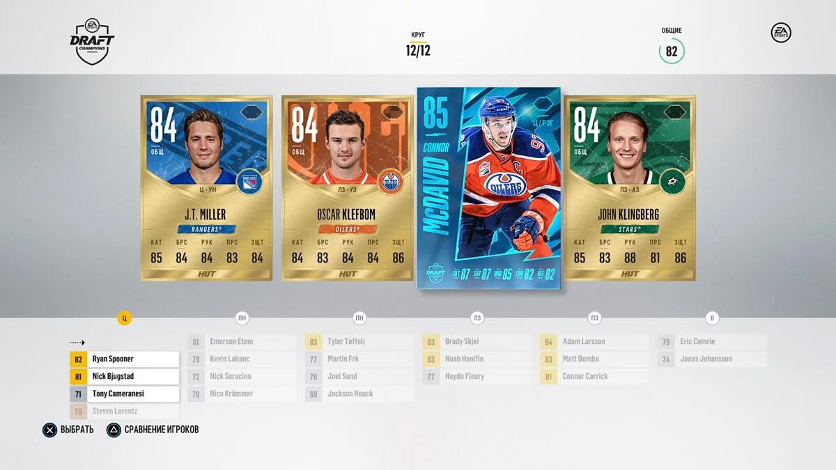 Сам процесс драфта проходит довольно тривиально: каждый игрок представлен в виде красиво оформленной карточки. Сначала игрок получает команду из довольно посредственных ребят, но потом, в ходе 12 замен, может набрать уже более умелых хоккеистов.