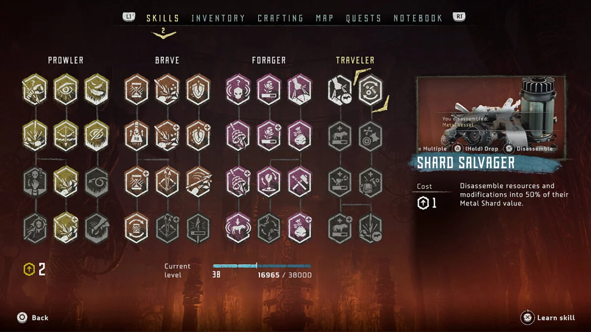 Одним из главных обновлений в Frozen Wilds, касающихся непосредственно Элой, является добавление новой ветки навыков под названием «Путешественник». Эта новая ветка, в основном, фокусируется на перках, которые влияют на то, как Элой взаимодействует с окружающим миром и с прирученными ее машинами.