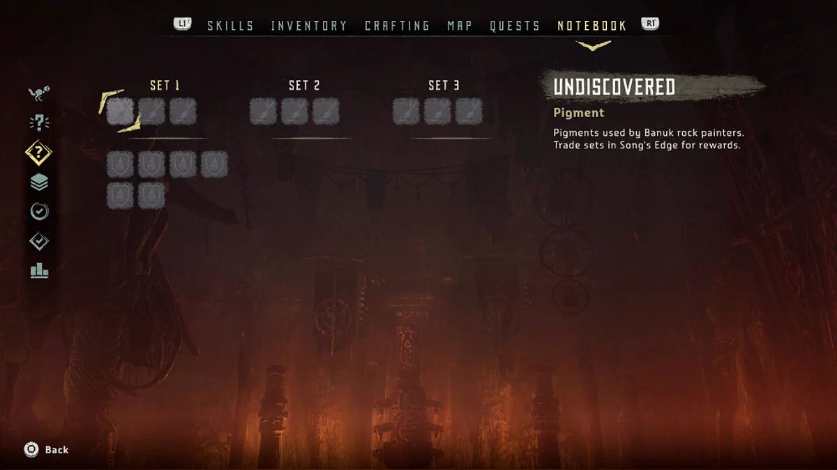 В Frozen Wilds появилось два новых вида коллекционируемых предметов. Первый из них — Пигменты. Их всего три набора по три пигмента в каждом, то есть всего таких предметов можно собрать девять штук. Их можно отнести художникам Банук в «Грани Песни» и получить вознаграждение.