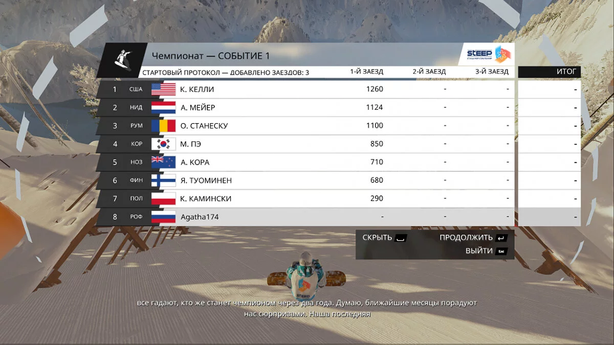 Для первых есть довольно удобная система настраиваемых чемпионатов, где можно ограничить список участников своими друзьями из Uplay, а для вторых — сезонная активность, которая имеет привязку ко времени и как бы повторяет расписание подготовительных мероприятий настоящей Олимпиады. А за победу в онлайне девелоперы даже обещают свозить в Корею в 2018 году.