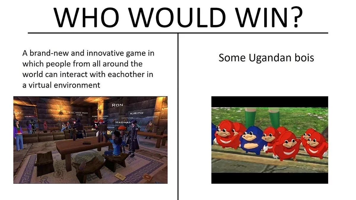 В течение последних двух недель VRChat была перегружена моделями мема «Угандийский Наклз», оригинальная версия которых изначально была создана пользователем под ником tidiestflyer. Десятки игроков стали активно использовать данную модель в качестве игрового персонажа. Вместе с этим в чате геймеры использовали различные «фразочки» с угандийским диалектом вроде «You do not know the way» (ты не знаешь верного пути). Вдобавок к этому, игроки часто выкрикивали всевозможные упоминания об Уганде, Эболе и других вещах, которые резко влияли на настроение пользователей внутриигровой комнаты чата.