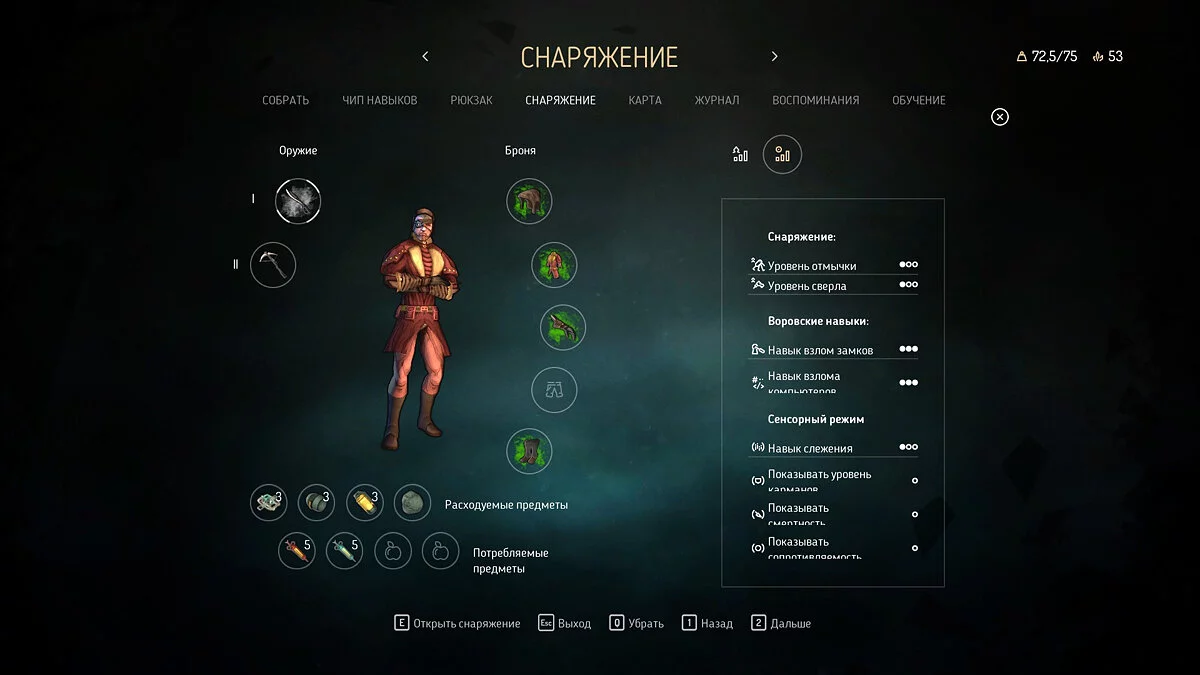 Тем не менее, оптимальнее всего в первую очередь поднять до максимума «Воровские навыки», затем уровни отмычки и сверла. «Сенсорный режим» лучше всего развивать в последнюю очередь. К слову, в нем наиболее эффективный навык — это «Показывать сопротивляемость», потому что он может пригодиться на боссах и других опасных противниках, которые встречаются во второй половине прохождения игры.