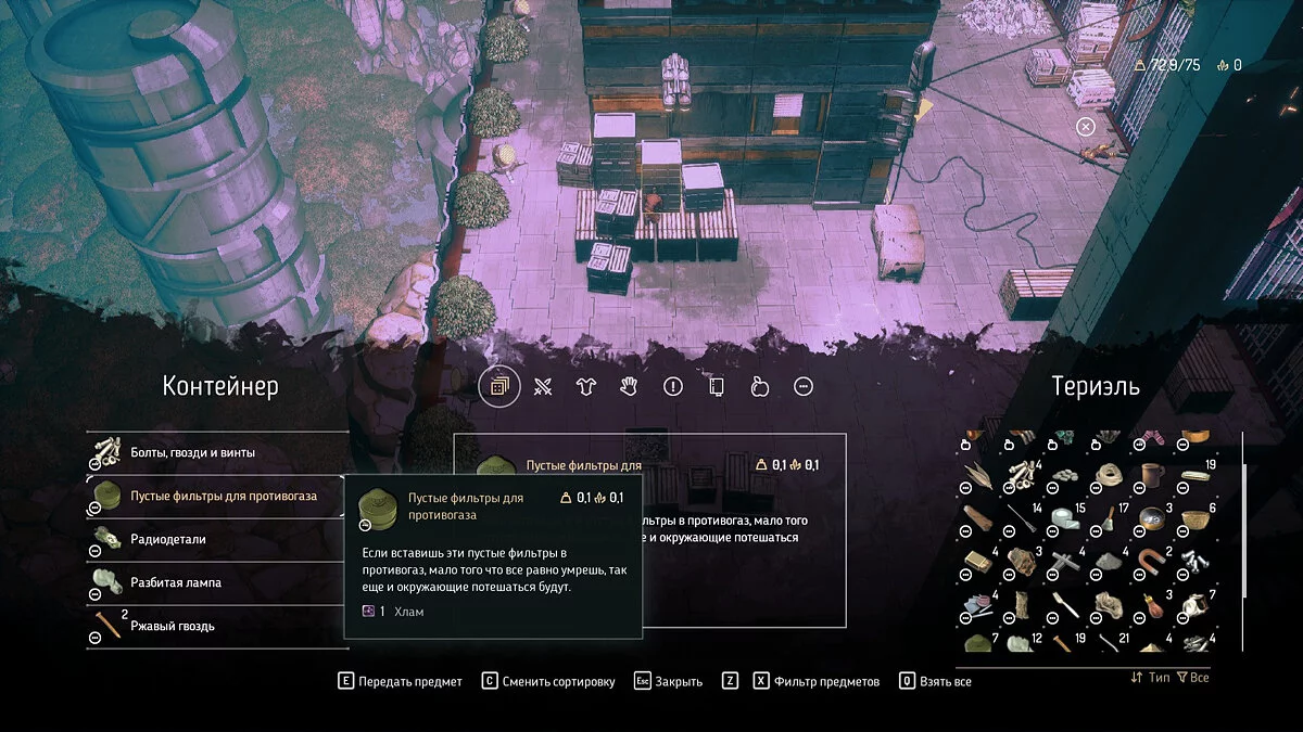 Благодаря этому разработчики нивелировали необходимость сбора абсолютно всех предметов, дав нам возможность играть, а не быть Плюшкиными. Главное, о чем стоит помнить, это запас ресурсов. Разумеется, хранить их в инвентаре можно, но это неудобно, потому что в некоторых зонах можно найти много ценностей, и тогда придется что-то выкидывать.