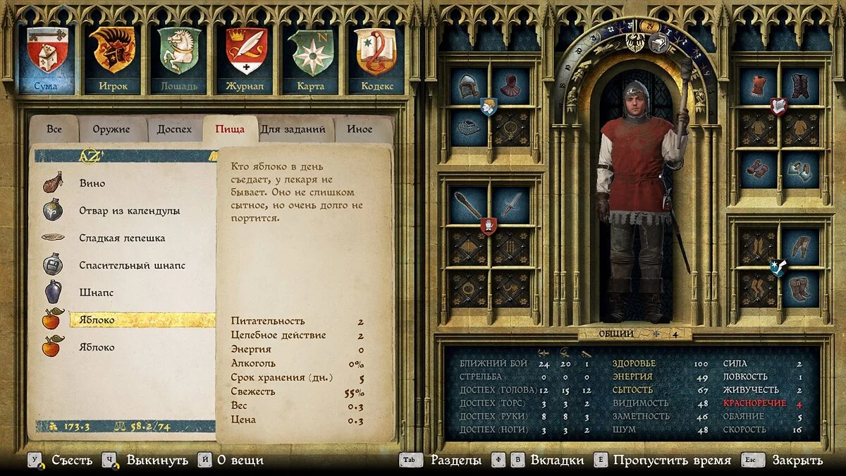 Помимо основных характеристик есть еще и 10 навыков. Тут нашлось место и верховой езде, и карманным кражам, и охоте, и обслуживанию брони и оружия, и даже травничеству с алхимией. При этом бесполезных навыков в игре нет, практически все можно использовать с выгодой для себя. Ну разве что от пьянства толку чуть, но этот навык по ходу игры как-то сам собой «качается». Средневековье же!