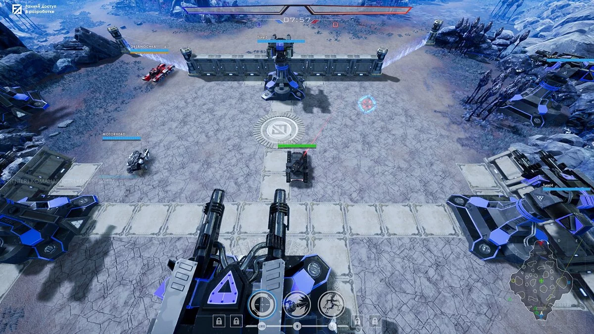 Любопытная особенность FeArea заключается в концепции базы. Это не просто место, где техника «возрождается» после уничтожения, а настоящая крепость. База защищена турелями и барьерами, через которые не проходят снаряды. Таким образом, отстрел новичков прямо на «респауне» практически невозможен.