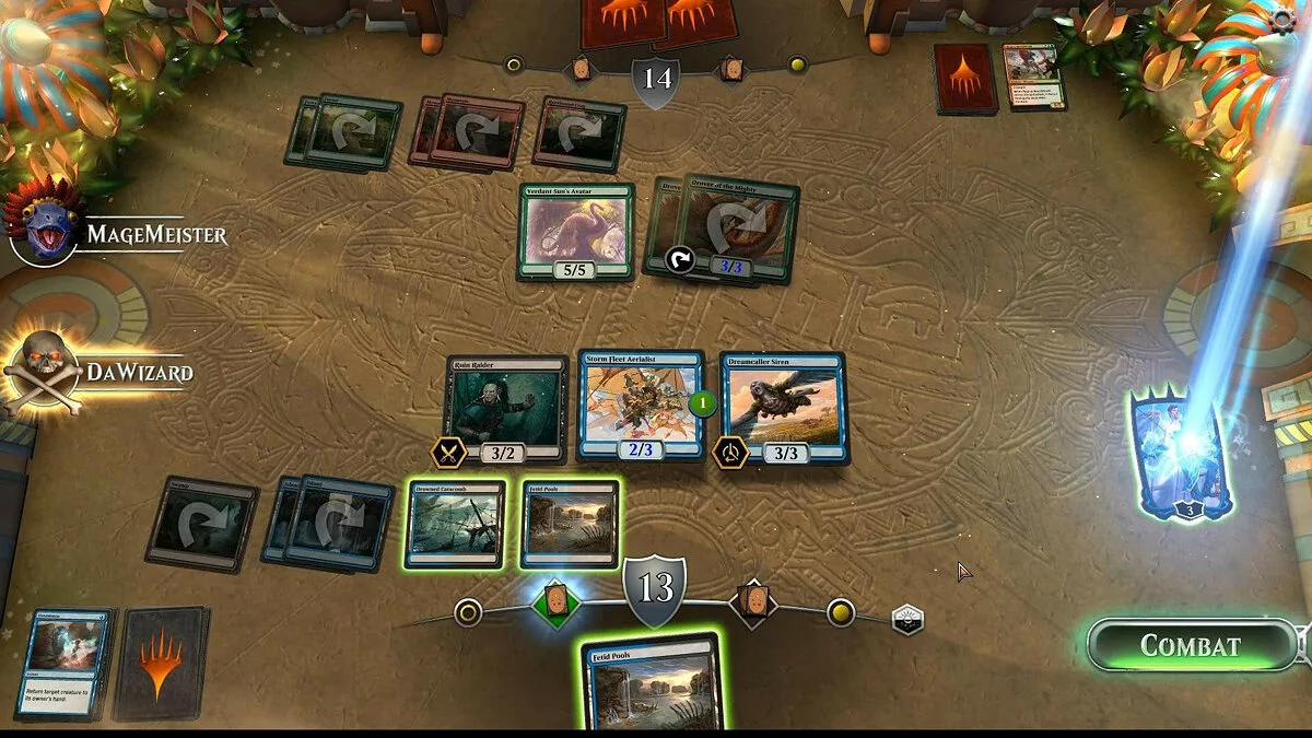 Самое интересное в игре происходит во время боев. Они проходят по оригинальным правилам Magic: The Gathering и начинаются с того, что каждый игрок перемешивает колоду и берет из нее 7 карт. Далее, если заход вышел не самым удачным, можно пересдать эти карты, взяв на одну меньше. Когда оба игрока готовы, партия начинается.
