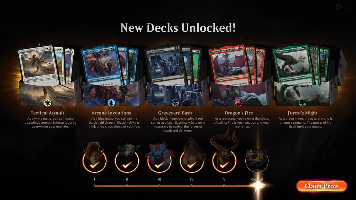 По итогам обучения игрок получает доступ к 5 стартовым колодам, по одной на каждый цвет «Магии». Это хороший старт для новичка, потому что на первых порах в MTG самое сложное — это определиться, картами каких цветов хочется играть.