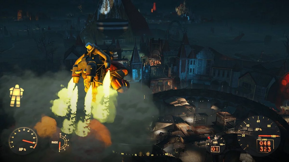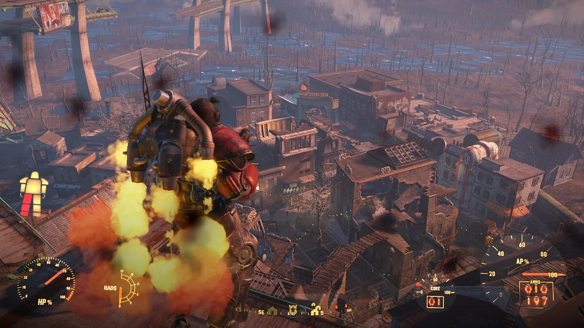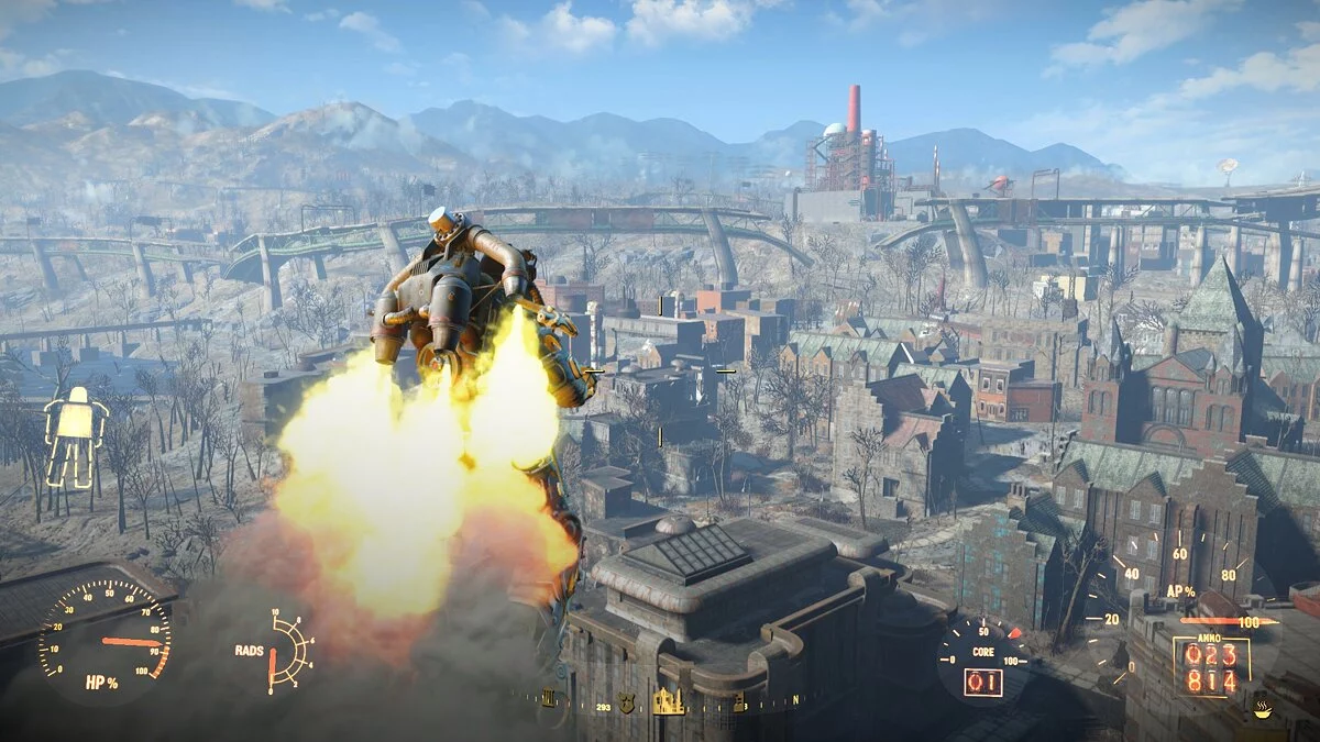 В Fallout 4 реактивный ранец потребляет так много очков действий, что их хватает всего на 2-3 секунды. Полет также сильно разряжает ядерный блок. По этой причине в стоковой версии игры можно подняться на высоту 3-4 метра или всего лишь перелететь между соседними крышами домов, что, по большому счету, бесполезно.