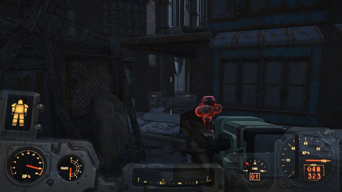 Начнем обзор со многим известной скрытой локации около Даймонд-Сити. Добраться туда можно и с помощью обычного прыжкового ранца, мод необязателен. Область находится с южной стороны от города. Если стоять лицом к входу в город, то надо двигаться по правой стороне стадиона, к полуразрушенному зданию, у которого есть мост между крышами: