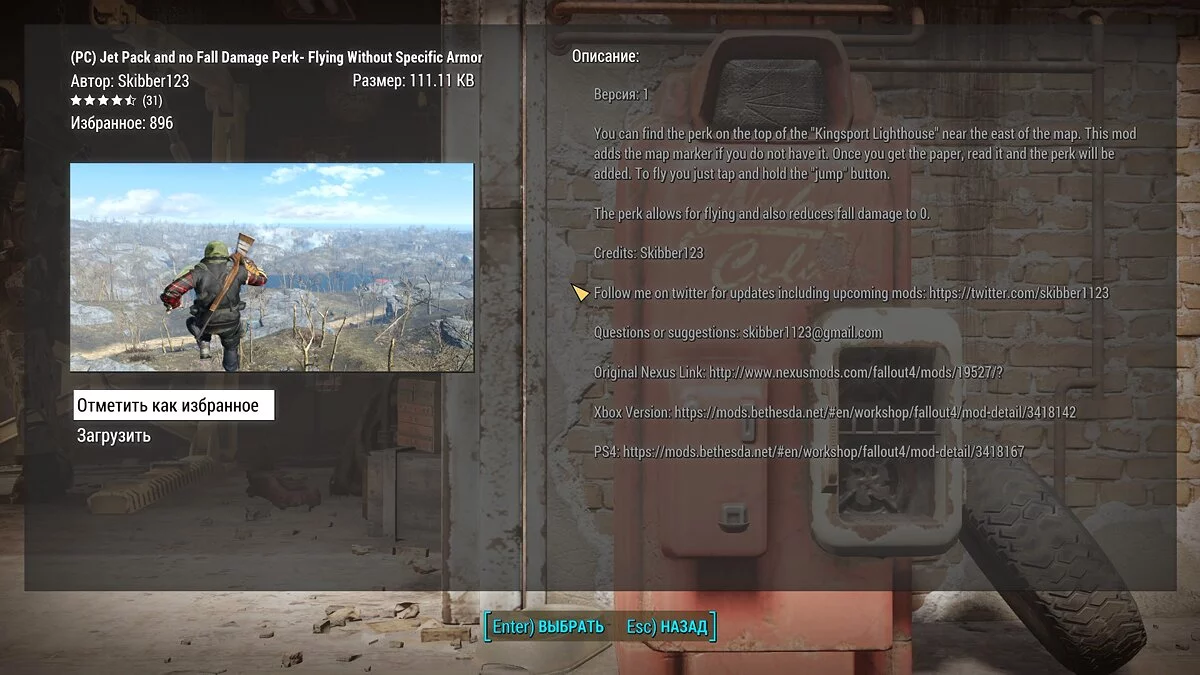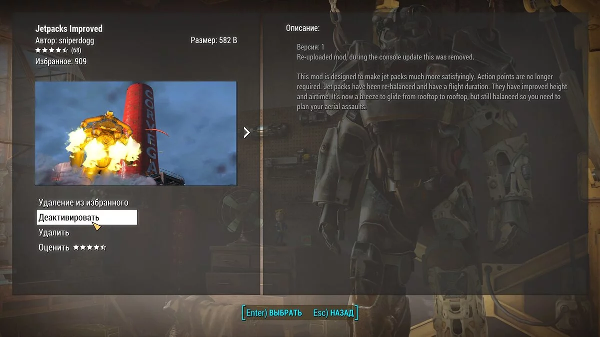 Не все моды Fallout 4 могут работать с последней версией игры, поэтому советуем проверять моды по одному, установка сразу нескольких модов на реактивный ранец сломает геймплей или управление. Учтите, что моды станут активны уже в другой «вселенной» Fallout 4, сохранения будут помечены литерой М, а достижения Steam будут отключены.