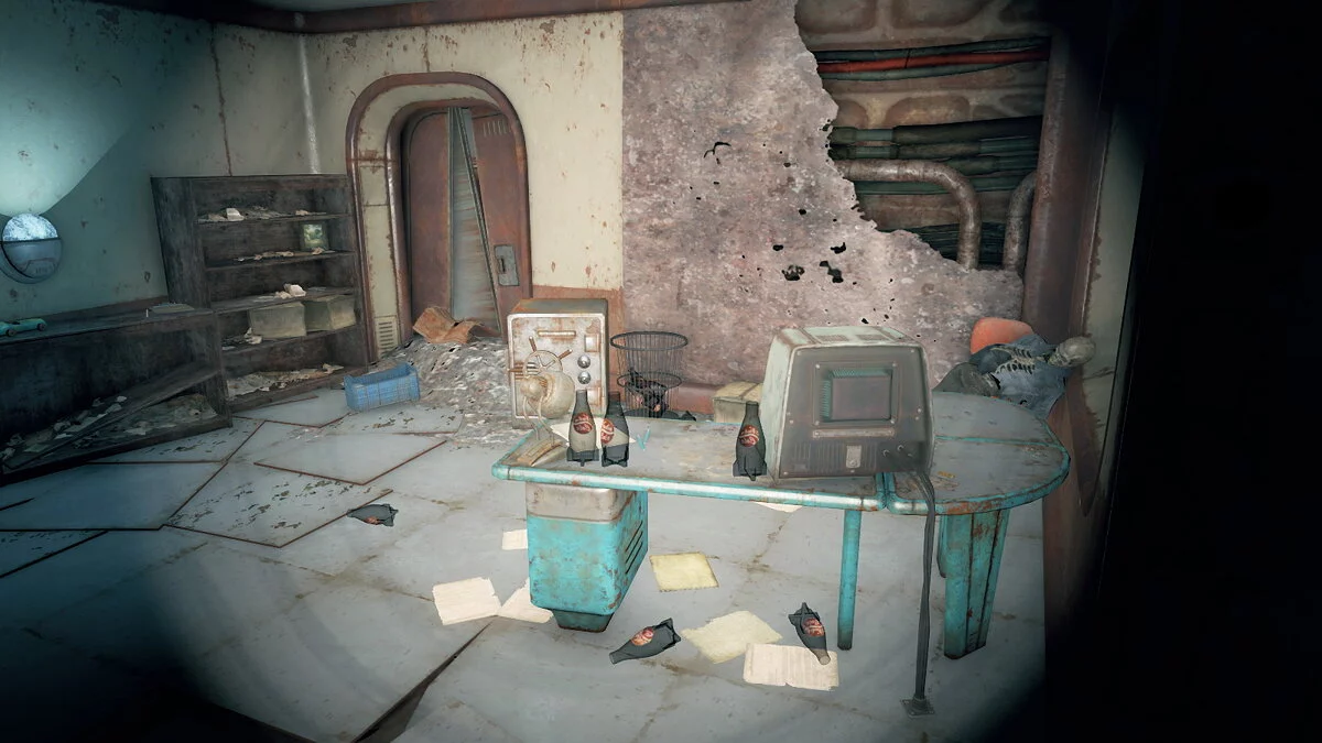 Дверной проем перегорожен ящиками, но нужно пройти прямо и зайти в последнее окно. В этой комнате можно обнаружить немного ресурсов и станцию обслуживания силовой брони. Это отличное место, что бы безопасно хранить свое барахло в центре пост-апокалиптического Бостона. Никто из рейдеров или супермутантов сюда не доберется.