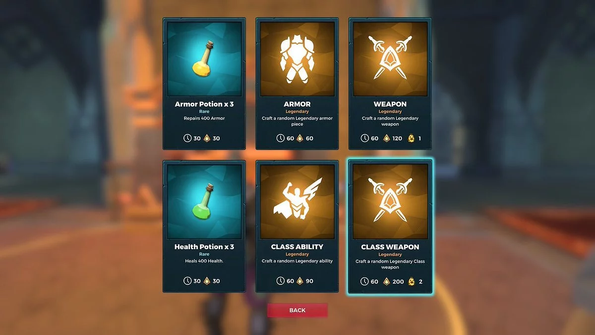 Самое дешевое предложение — это зелья здоровья и брони — всего 30 осколков. За 60 осколков можно создать элемент легендарной брони, за 90 — легендарную способность вашего класса. Собрав 120 осколков можно получить легендарное оружие.