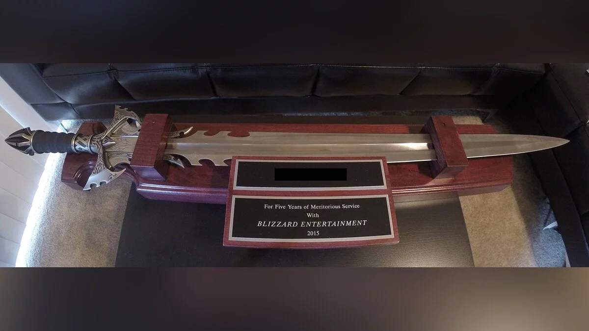 А это — копия меча из World of Warcraft, которая вручается работникам за 5 лет непрерывной службы. Примечательно, что все подарки Blizzard ориентированы на фэнтези-тематику: за 10 лет сотрудник получает щит, а за 20 — шлем. Все награды компании можно посмотреть на её сайте.