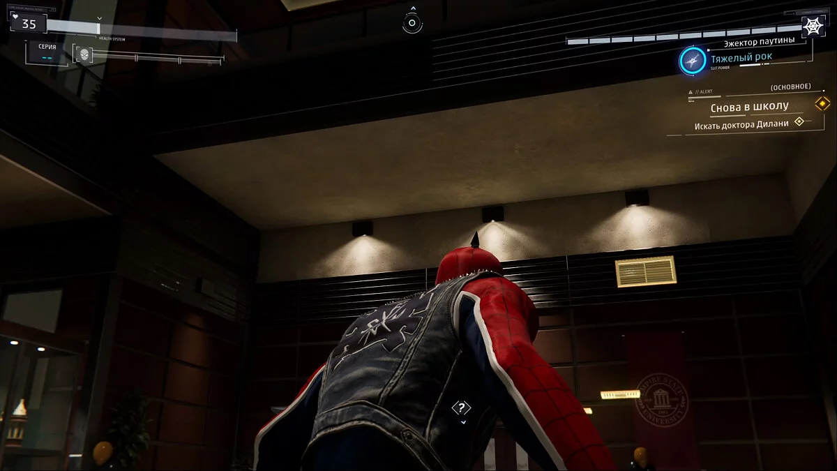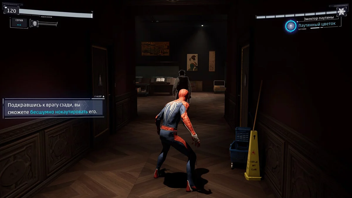 Заходим в здание, тут нас уже ждут противники. Тут игра знакомит нас с концентрацией (чем больше заполнена шкала, тем больше урона наносит паук). Еще при помощи концентрации можно лечиться (вниз на крестовине).