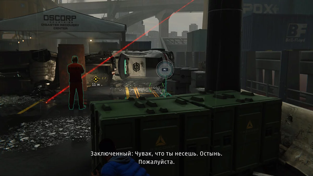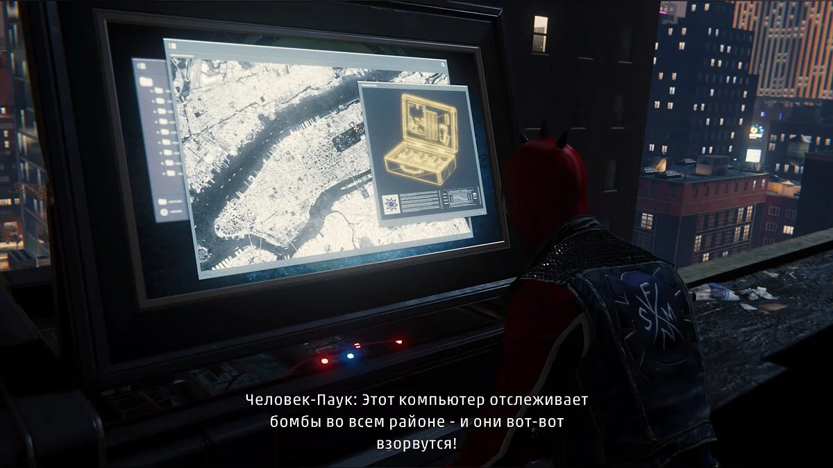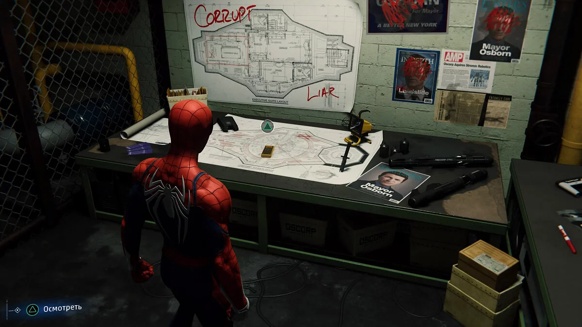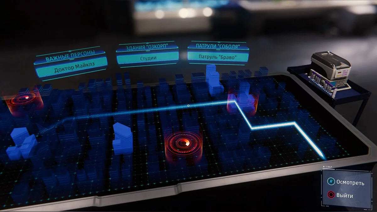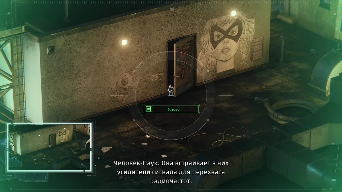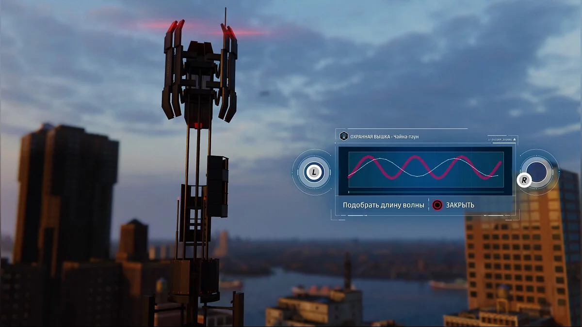 После выхода из лаборатории говорим с Юри Ватанабе и отправляемся на крышу полицейского участка. Она попросит починить охранные вышки Oscorp. Для этого нужно пройти мини-игру, вращая стики на геймпаде. Работающая вышка показывает все интересные места на карте в радиусе своего действия.