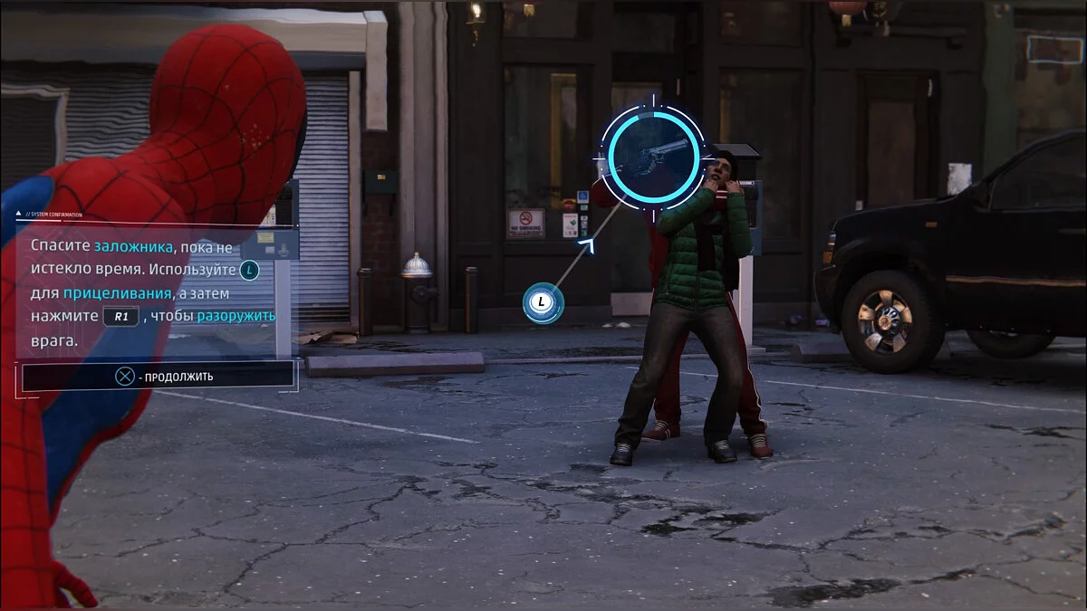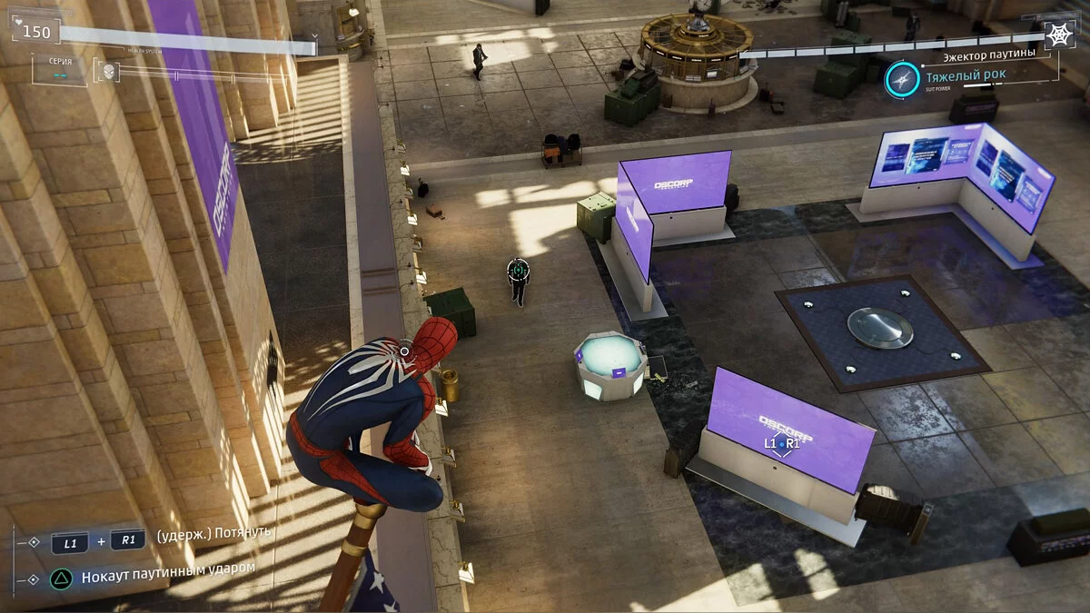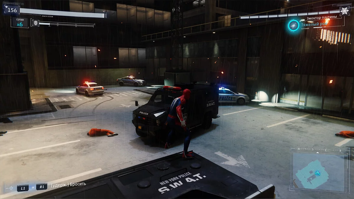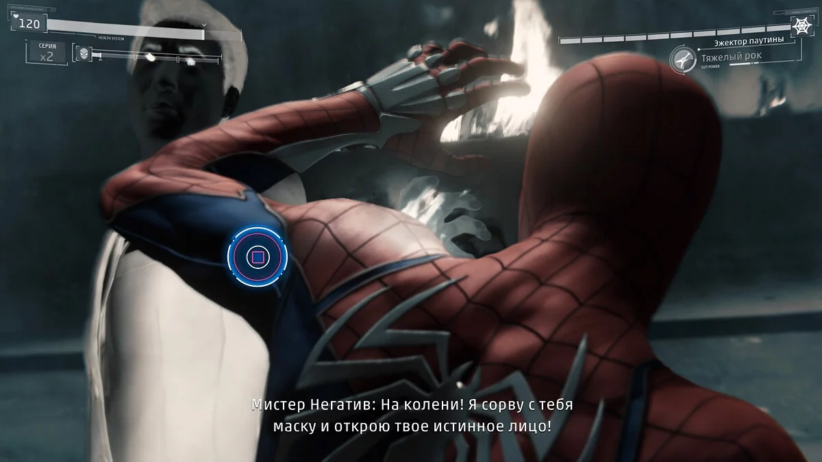 Отправляемся на Таймс-сквер, тут нас уже ждут люди Уилсона Фиска. Будет драка. Используем «квадрат» для быстрых ударов, зажимаем «квадрат», чтобы подбросить врага в воздух. Используем «треугольник», чтобы сократить дистанцию между пауком и противником, против вооруженных огнестрельным оружием врагов и для нокаутов. В сражениях активно используем окружение — бросаем различные предметы, нажав «L1+R1». Пользуемся паутиной, нажимая на «R1» (обездвиживает на время или навсегда, если враг находится у какой-то поверхности). Таким образом можно наносить несколько ударов врагу и приклеивать его к стене паутиной. «Паучье чутье» информирует игрока о приближающейся опасности (волны вокруг головы).