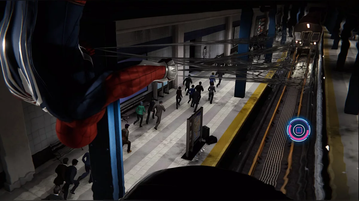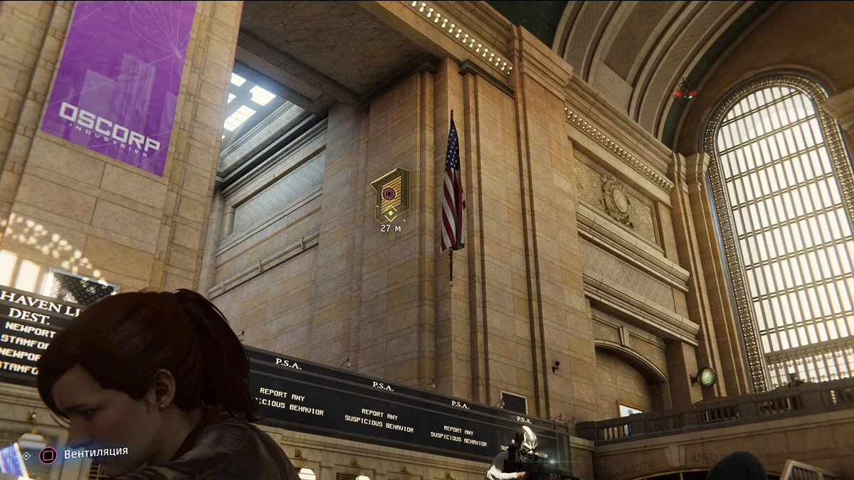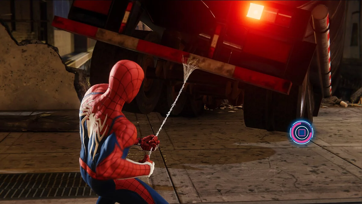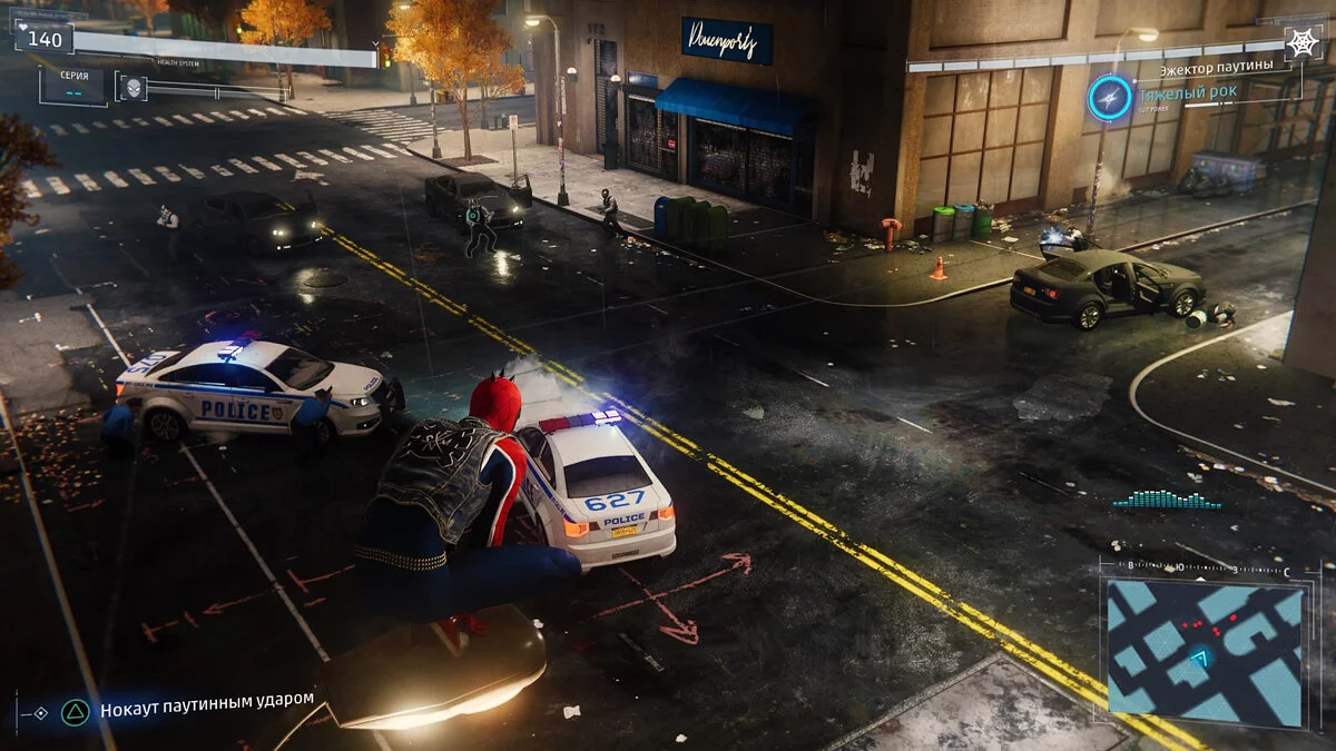 Отправляемся на Таймс-сквер, тут нас уже ждут люди Уилсона Фиска. Будет драка. Используем «квадрат» для быстрых ударов, зажимаем «квадрат», чтобы подбросить врага в воздух. Используем «треугольник», чтобы сократить дистанцию между пауком и противником, против вооруженных огнестрельным оружием врагов и для нокаутов. В сражениях активно используем окружение — бросаем различные предметы, нажав «L1+R1». Пользуемся паутиной, нажимая на «R1» (обездвиживает на время или навсегда, если враг находится у какой-то поверхности). Таким образом можно наносить несколько ударов врагу и приклеивать его к стене паутиной. «Паучье чутье» информирует игрока о приближающейся опасности (волны вокруг головы).