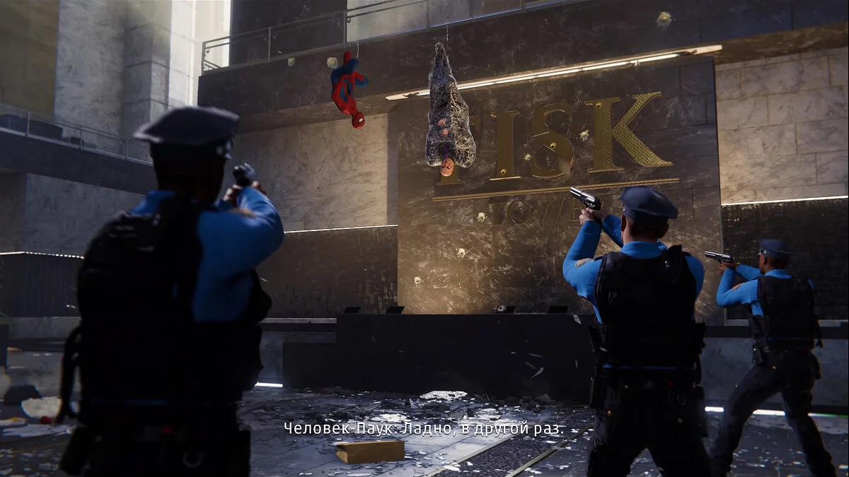 В большом зале появятся военные, но они тоже нападут на паука. Но мы научимся расправляться с противниками со щитами. Бросаем в них предмет и добиваем. Либо бьем по щиту, проскальзываем под противником и добиваем. Слушаем начальника полиции и отправляемся за самим Фиском.