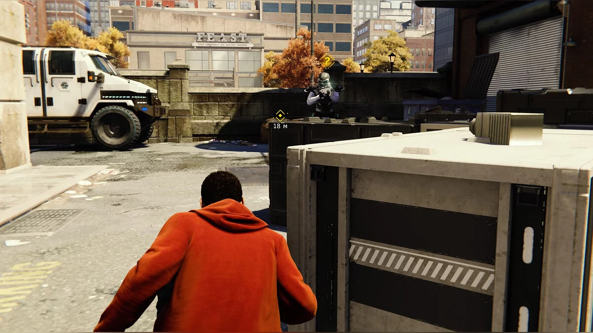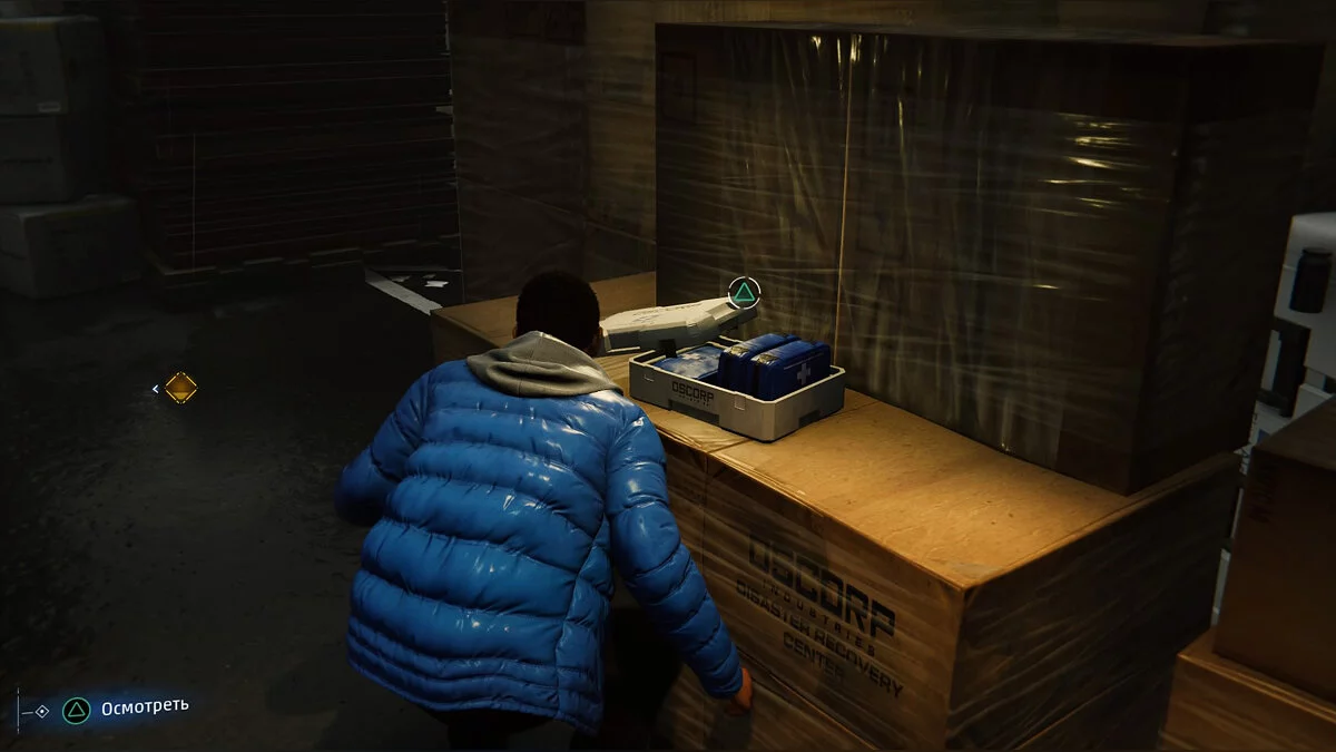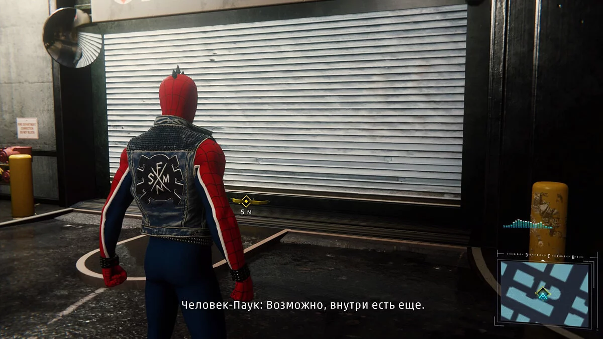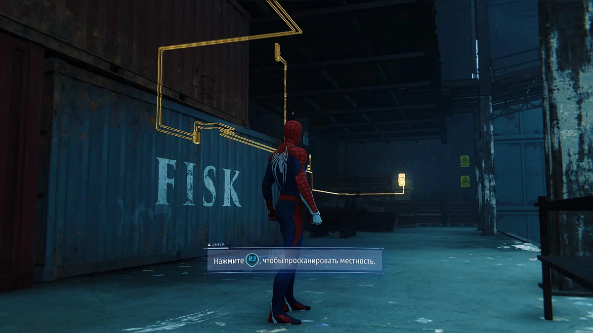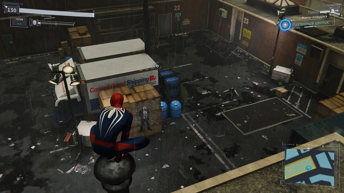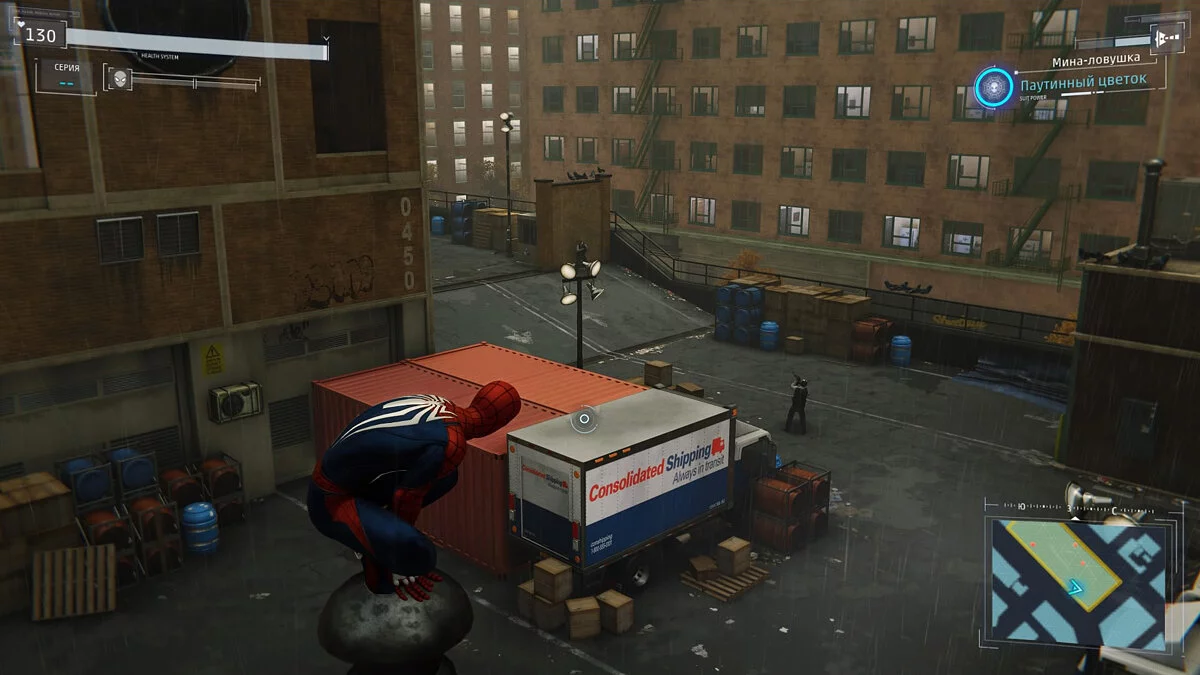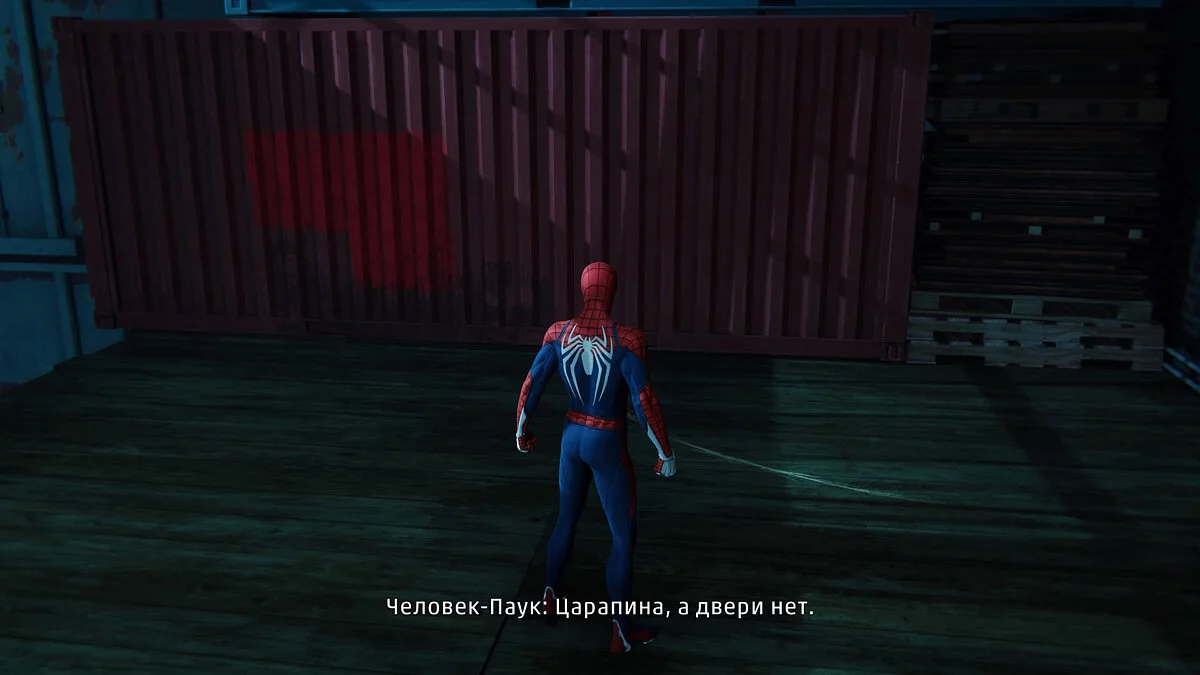 Идем за полицейским к подозрительному ящику. Находим щиток от двери контейнера на втором этаже, стреляем паутиной.