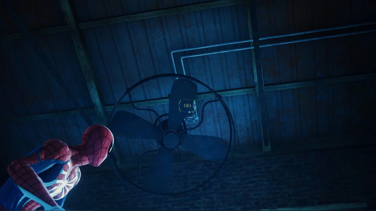 Щиток от второго тайника прикрыт большим вентилятором. Выжидаем момент и стреляем паутиной. Оказывается, щиток тут не один. Второй находится за лифтом. Чтобы до него добраться нужно поднять лифт.