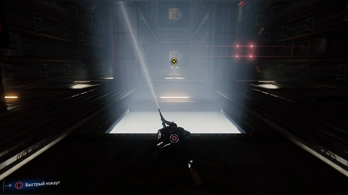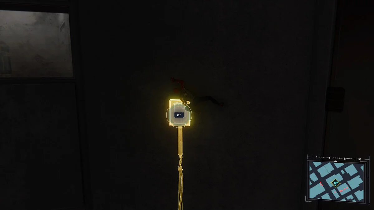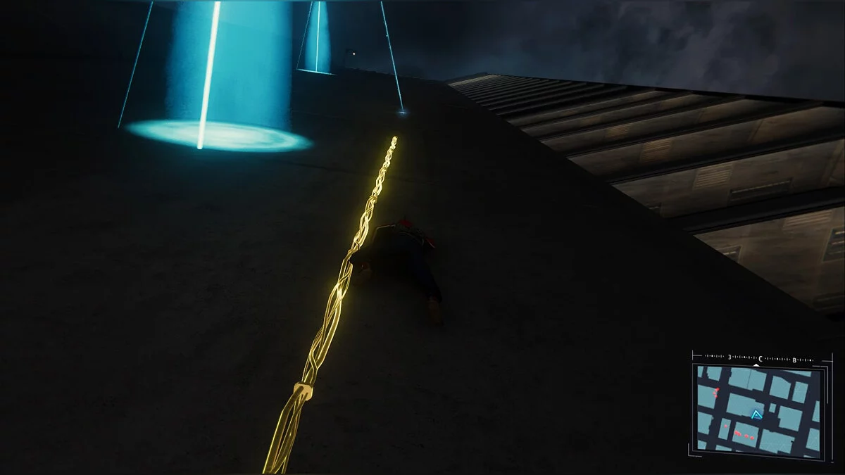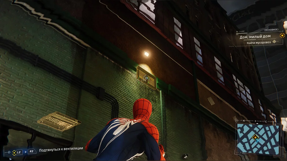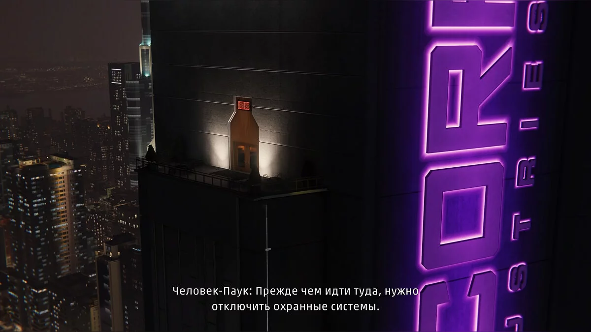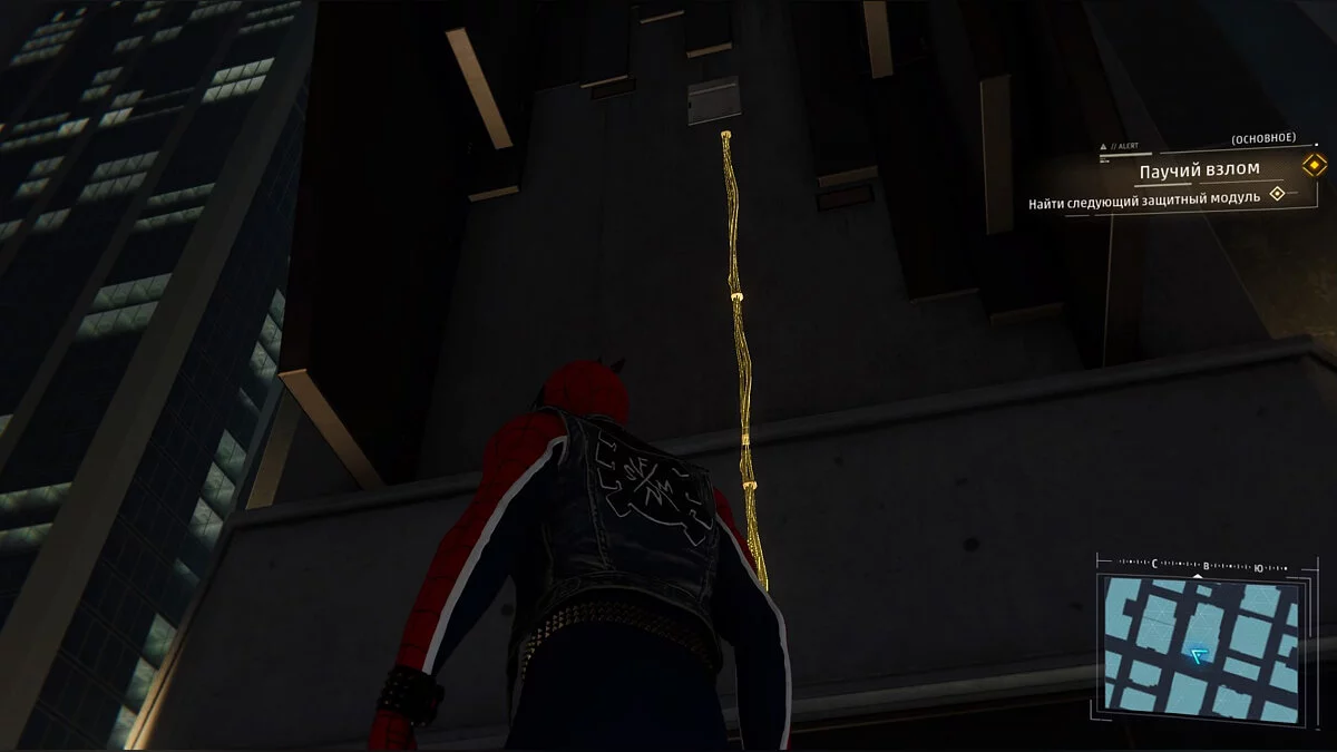 Теперь нужно отследить след вещества. Выбираем правый вариант и забираемся на крышу небоскреба рядом. Находим люк и попадаем внутрь. Стреляем паутиной в щиток, чтобы включить свет.