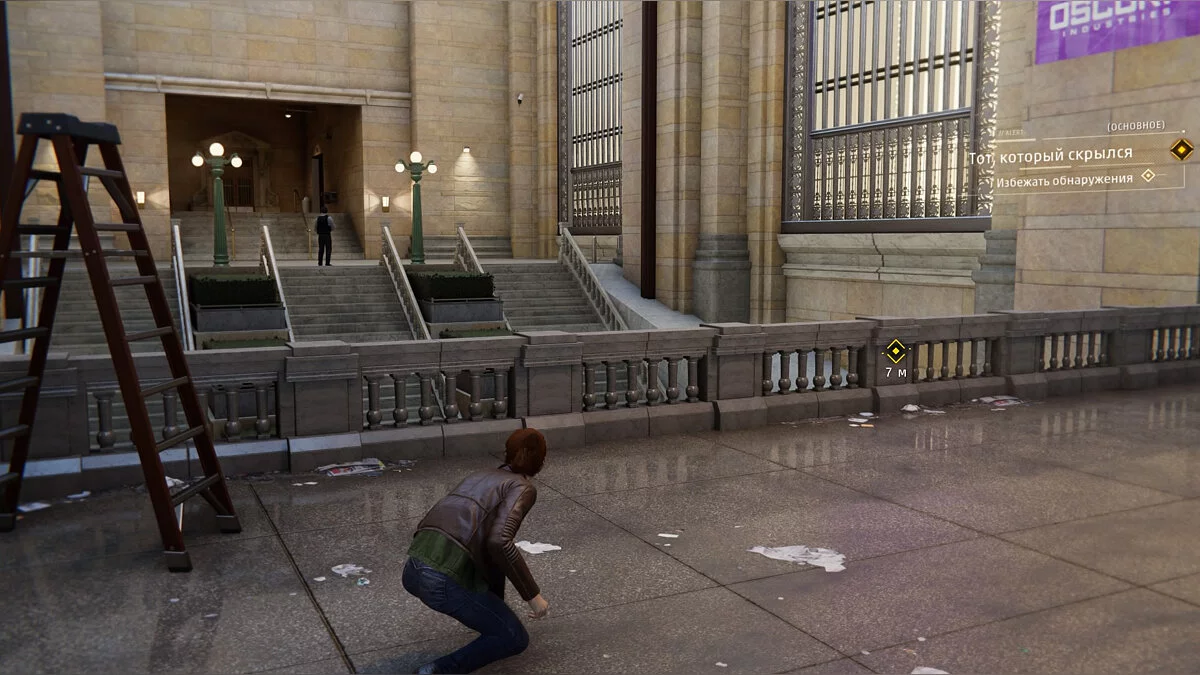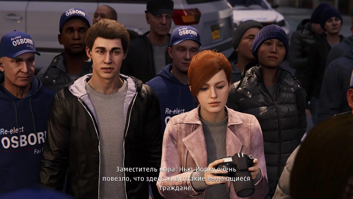 Чтобы разделить пару бандитов — стреляем в коробку паутиной. Затем вырубаем их по одному. На стене находим фотоаппарат Мэри Джейн Уотсон. Тут же появляется она и «рассказывает», что произошло.
