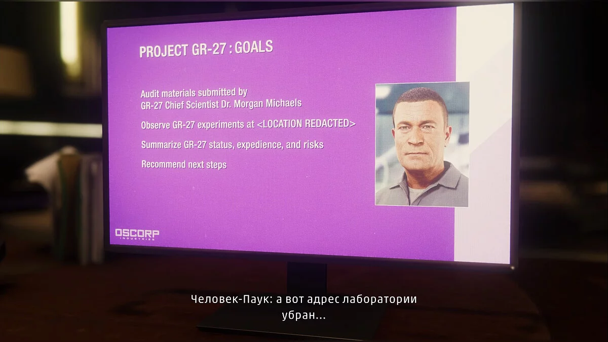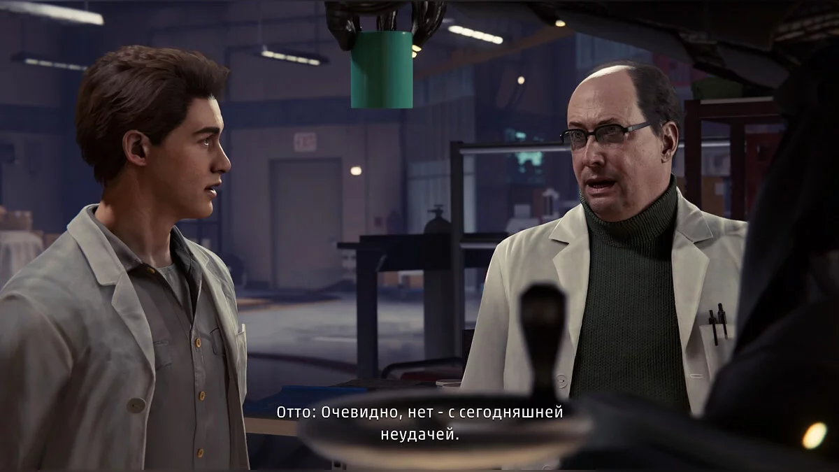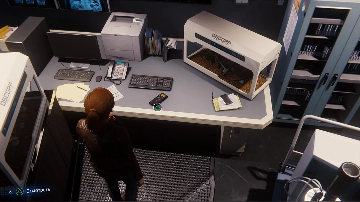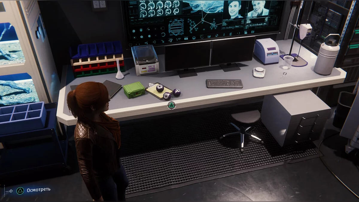 После динамичной битвы с Фиском нам показывают обычную жизнь Питера Паркера. Он работает в лаборатории. Переодеваемся в лабораторный халат и приступаем к работе. Отключаем аппарат. Пока идет диалог можно осмотреть лабораторию.