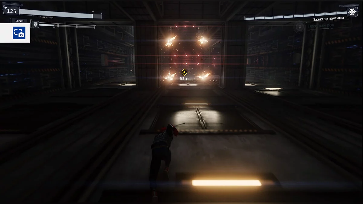 Сперва Фиск начнет атаковать паучка турелями, а сам спрячется за толстенное стекло. Уворачиваемся и в удачный момент стреляем в турель паутиной. Используем клавиши «R1+ L1», чтобы швырнуть турель в стекло. Повторяем со второй.