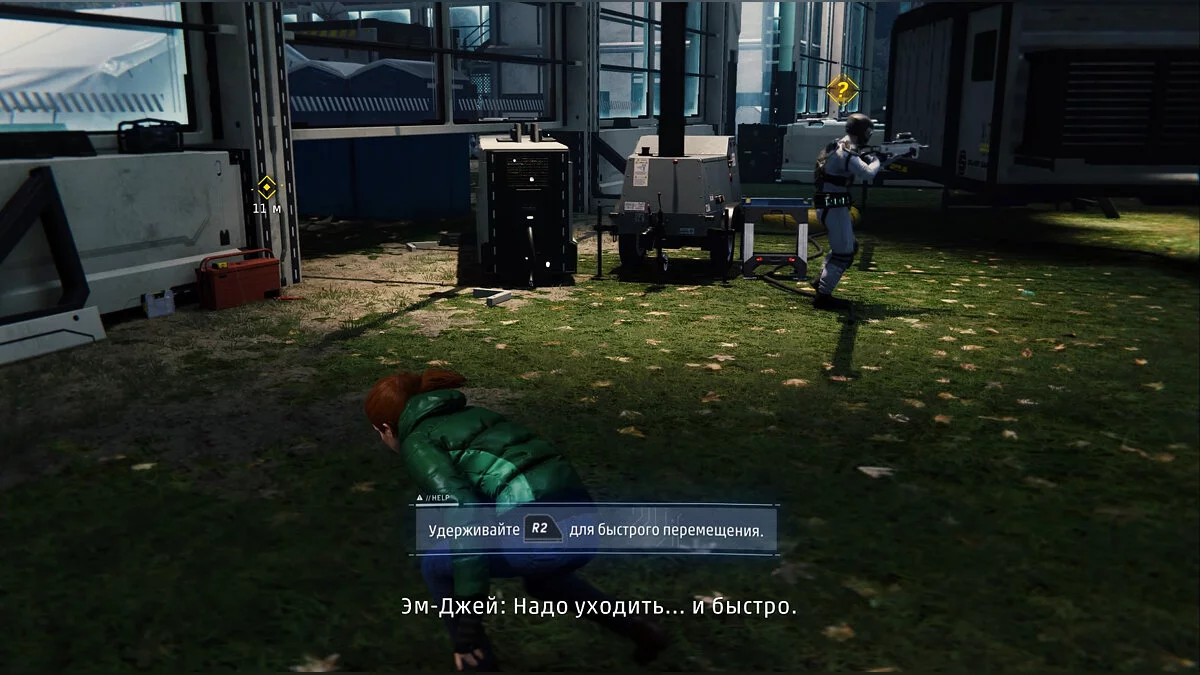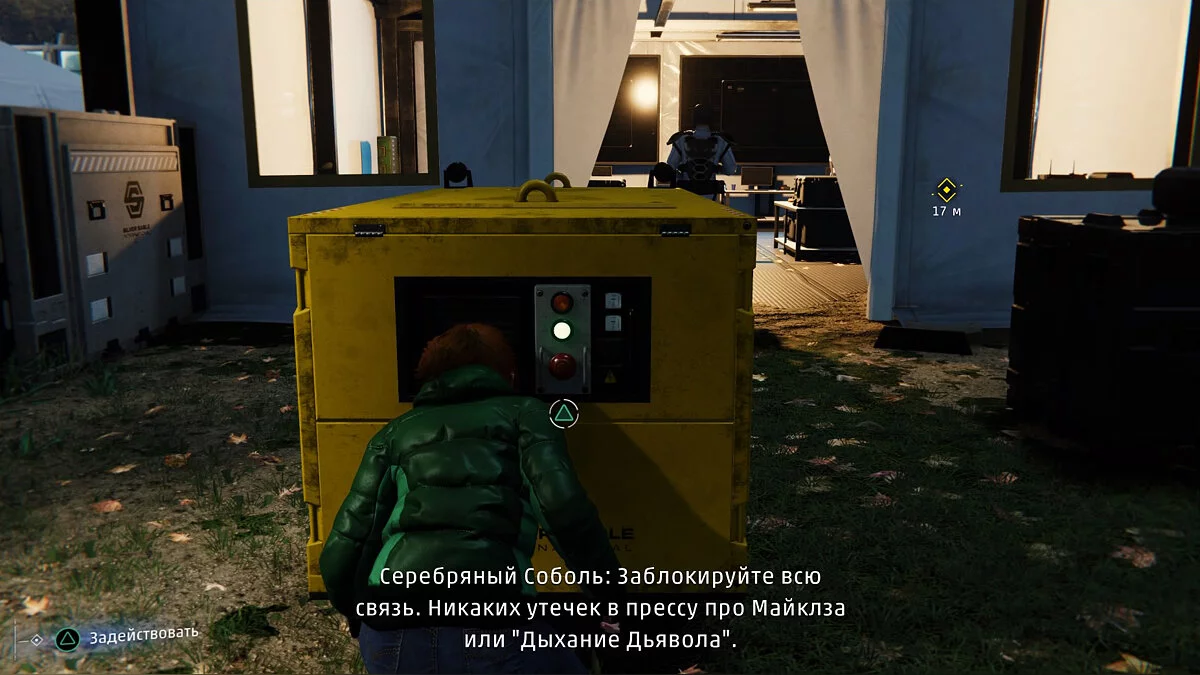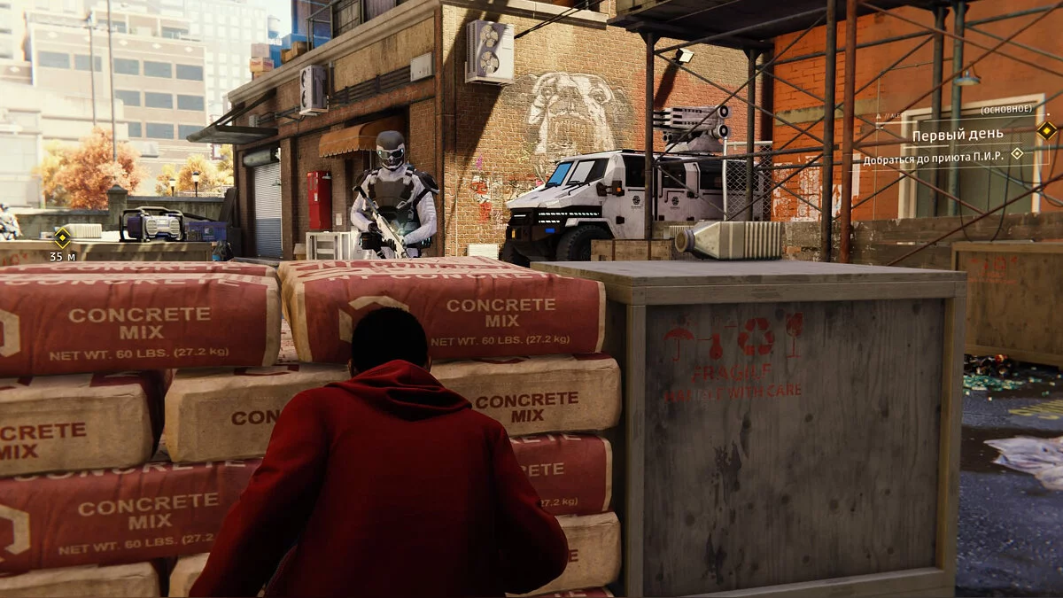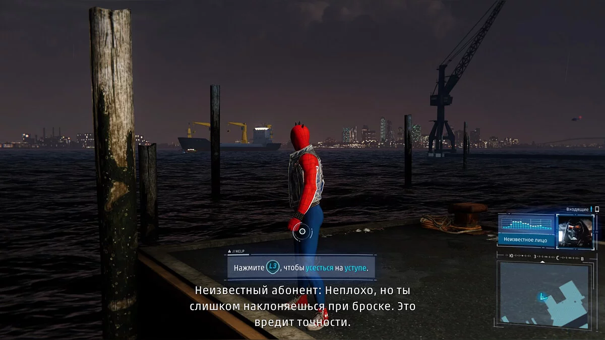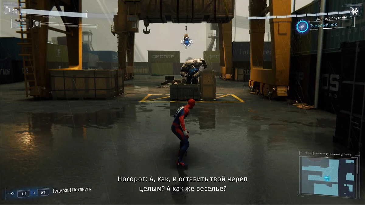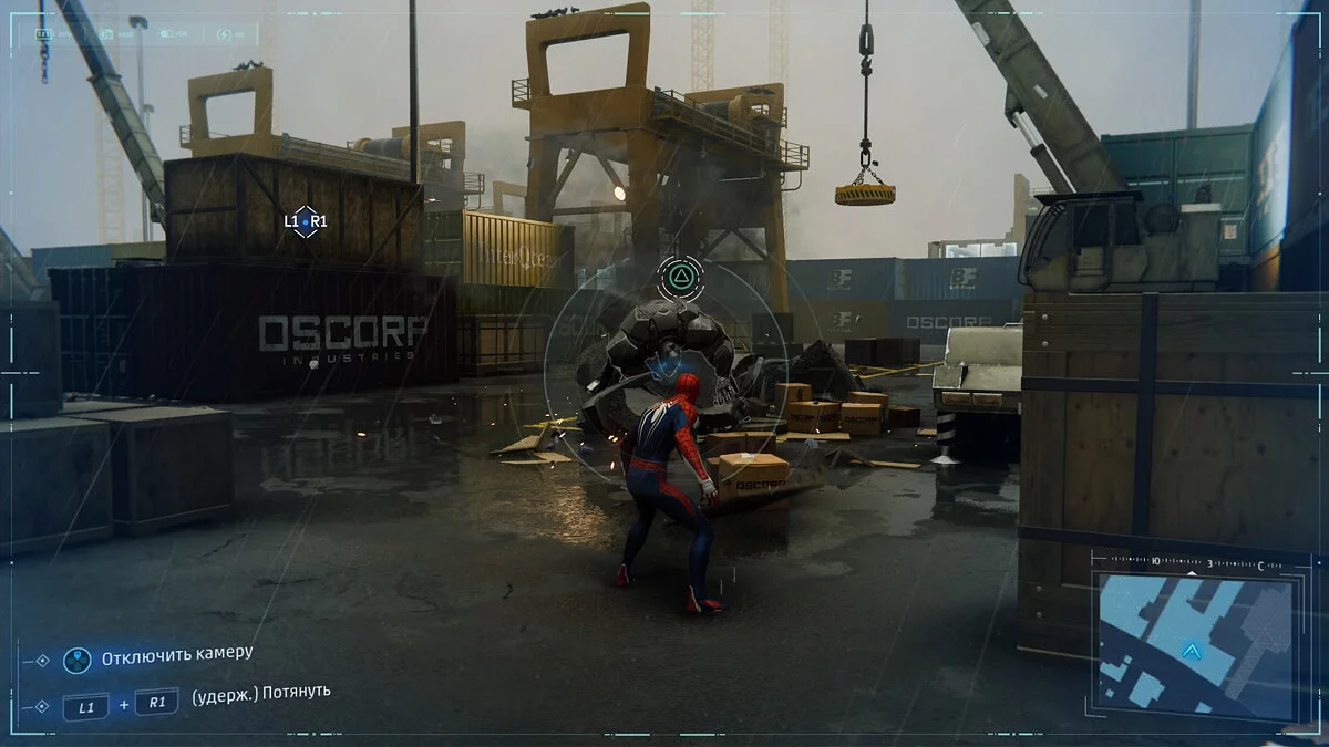 Говорим с Юри и отправляемся проверять строящееся здание. На стройке полно бандитов. Хорошо, что перед заданием мы получим новый гаджет — ударную паутину. Переключать гаджеты можно при помощи кнопки «L1». В дальнейшем гаджеты тоже можно улучшать за жетоны.