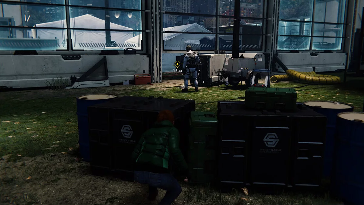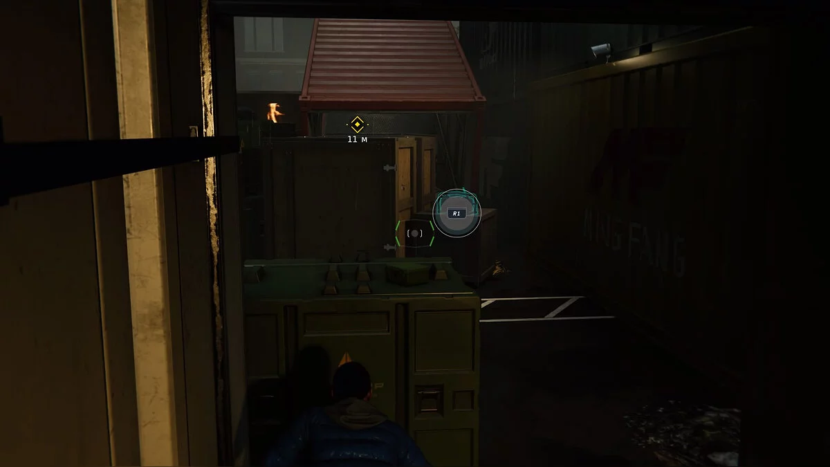 Перебираемся через кирпичную стену и находим первую часть лекарств. Но там нет нужных. Идем дальше и взламываем дрон (или шкаф с другой стороны), чтобы отвлечь врага.