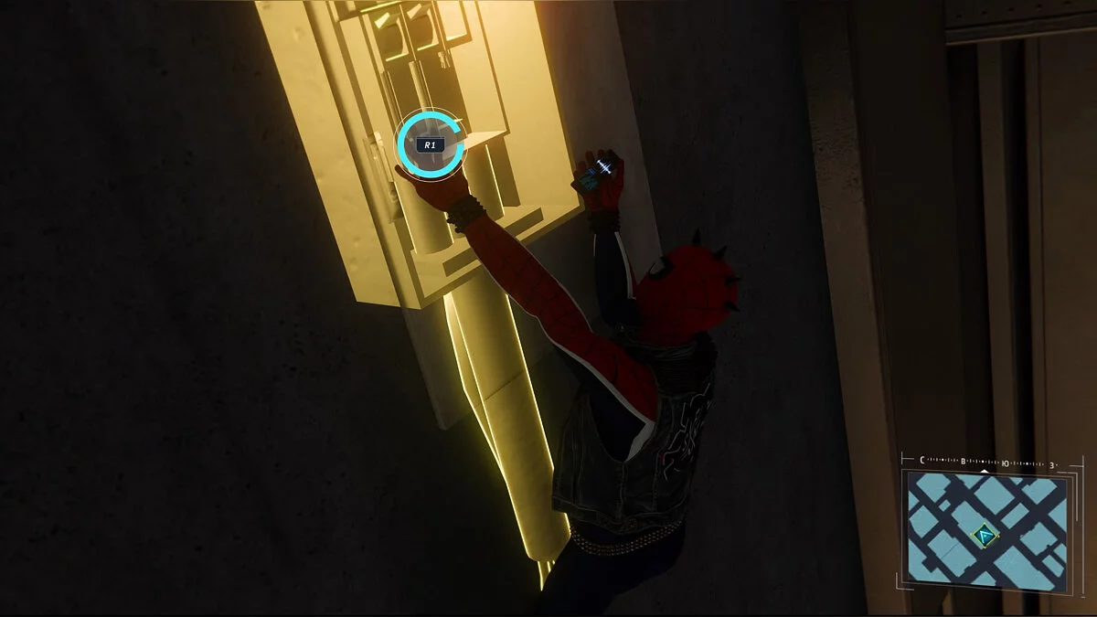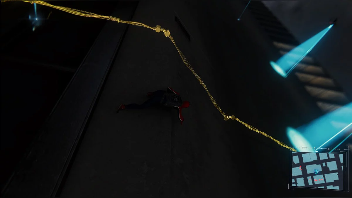 Отправляемся проверять информацию о взломе. Менеджер зала в заложниках. Ползем по вентиляции до решетки и спускаемся на балку. Противников, которые встают прямо под паука, можно подвесить на балку при помощи паутины (кнопка «квадрат»).