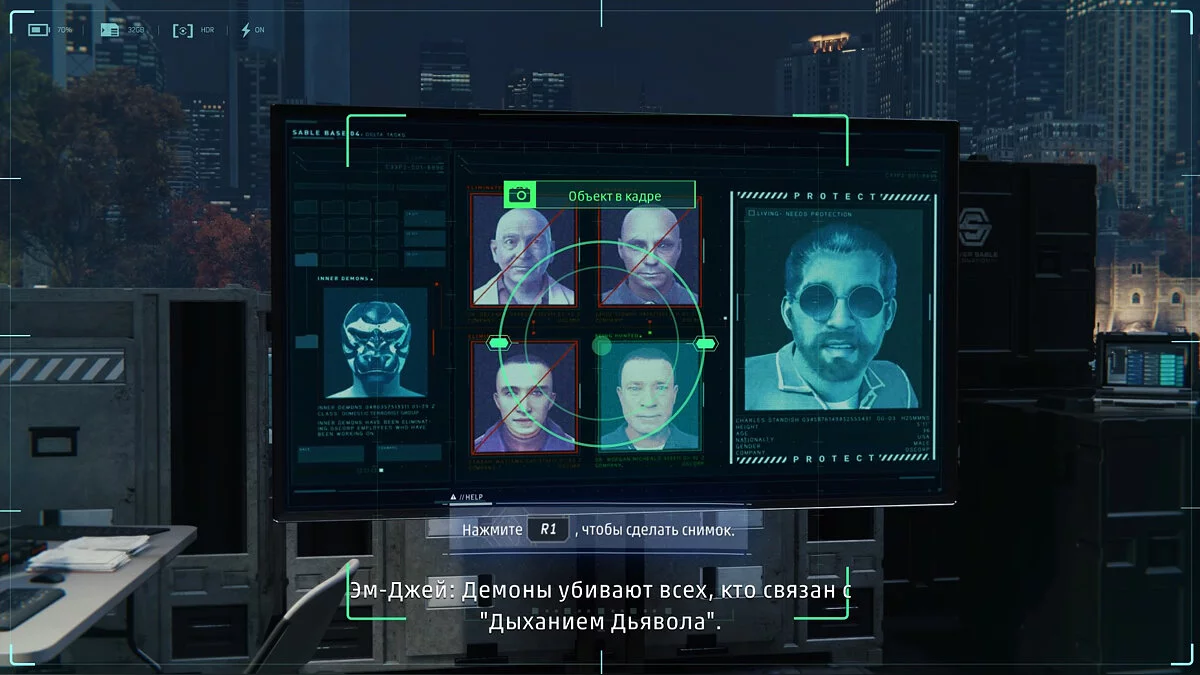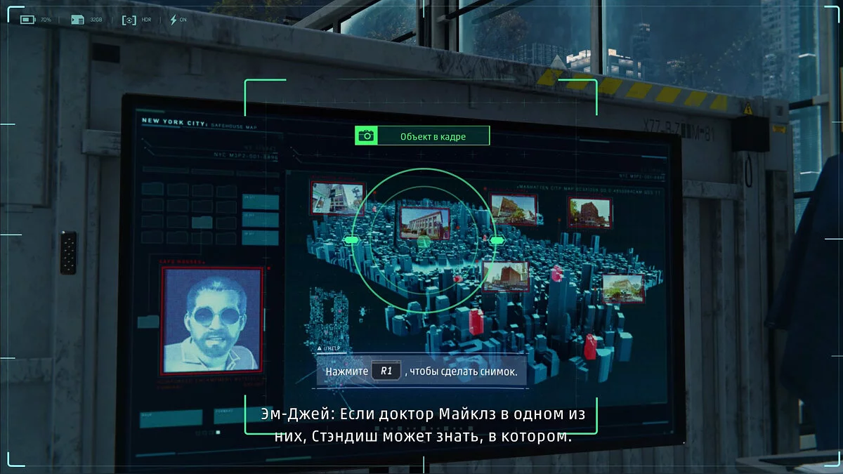 Очередное обучение выполнения дополнительных активностей. Отправляемся фотографировать Эмпайр-стейт-билдинг. Достаем фотоаппарат, нажав «вверх на крестовине». Ловим в кадре здание (L2) и фотографируем, нажав «R1». После этого на карте появятся остальные (50) достопримечательности (там, где работают вышки). За их фотографирование получаем жетоны. В награду получаем немного опыта.